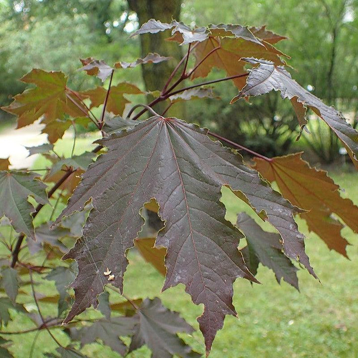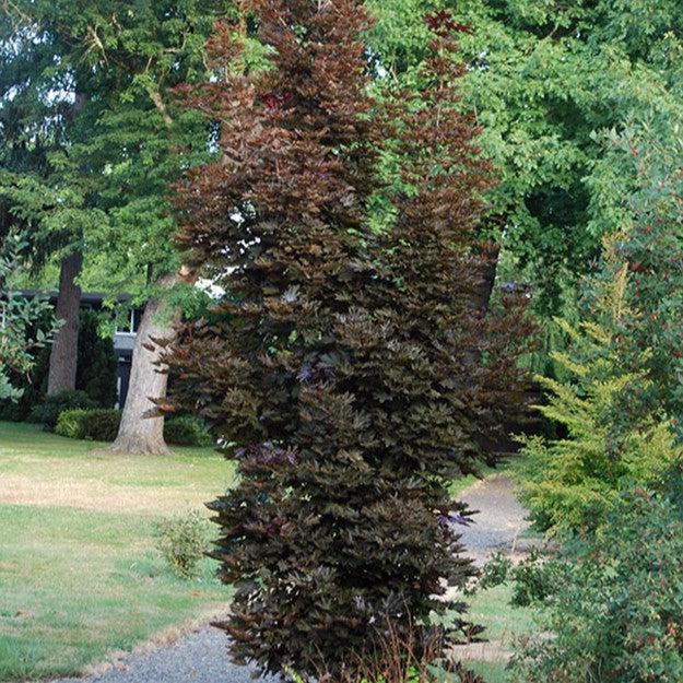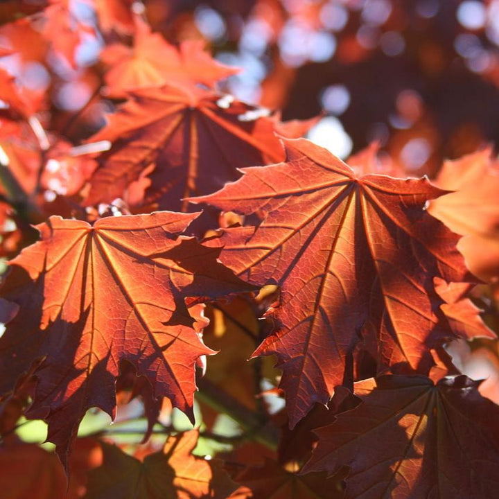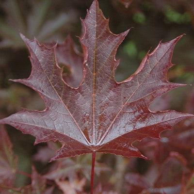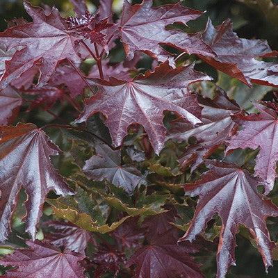 Crimson Sentry Norway Maple is a beautiful slow-growing deciduous tree with a very dense and narrow upright habit that is columnar when young and opens to oval as it matures. Its palmate foliage emerges bright red and matures to rich deep maroon-purple that holds well through summer before turning bright crimson for fall. Grows best in moist well-drained soils. Crimson Sentry is tolerant of strong winds, urban conditions, drought, and salt.