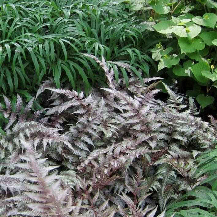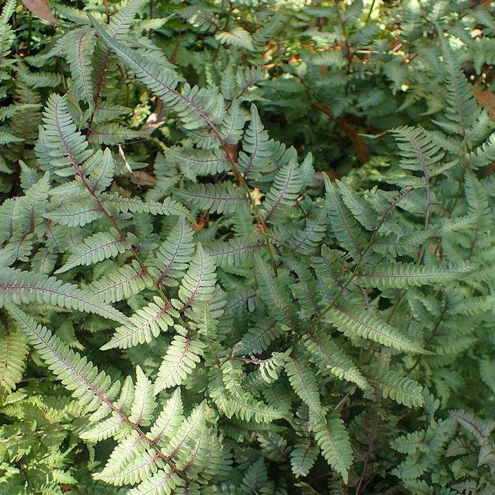 Monrovia® Burgundy Lace Japanese Painted Fern is a striking high-contrast deciduous fern with shimmering silver-green fronds that emerges with burgundy-purple overtones and retains its purple midribs as it matures. Best color with part shade and rich, moist well-drained soils. Drought tolerant once established.