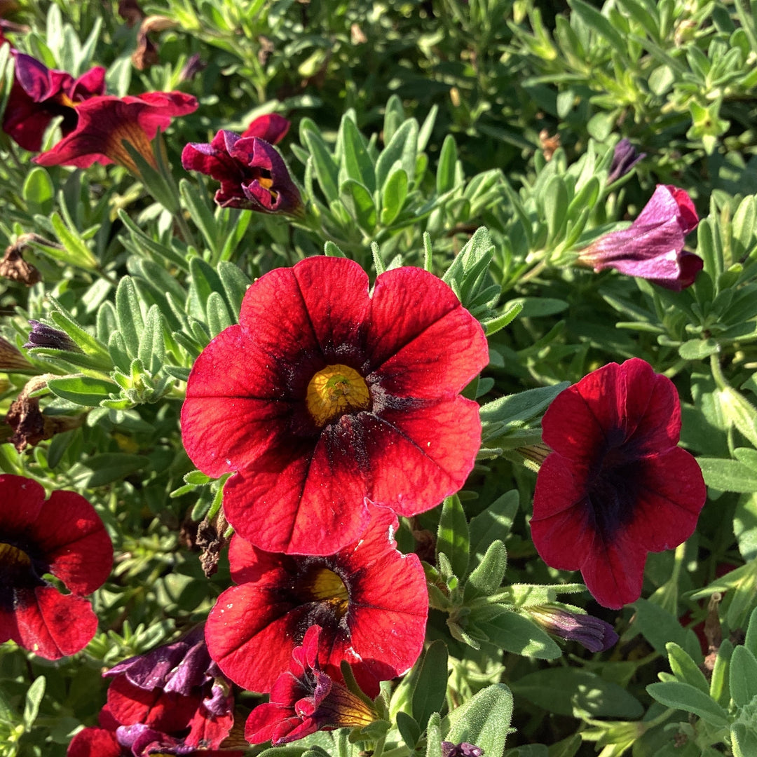 Cha-Cha Red Kiss Calibrachoa is a compact herbaceous annual with a mounded habit and cascading stems with small dark green foliage.  Abundant blooms of deep red flowers with a broad near-black stain leading to yellow centers bloom from early spring until the first frost.  Flowers best with full sun and moist, well-drained soils.  Tolerates drought and light shade.