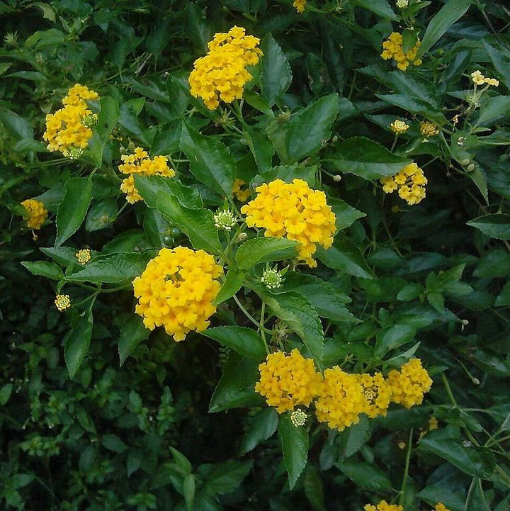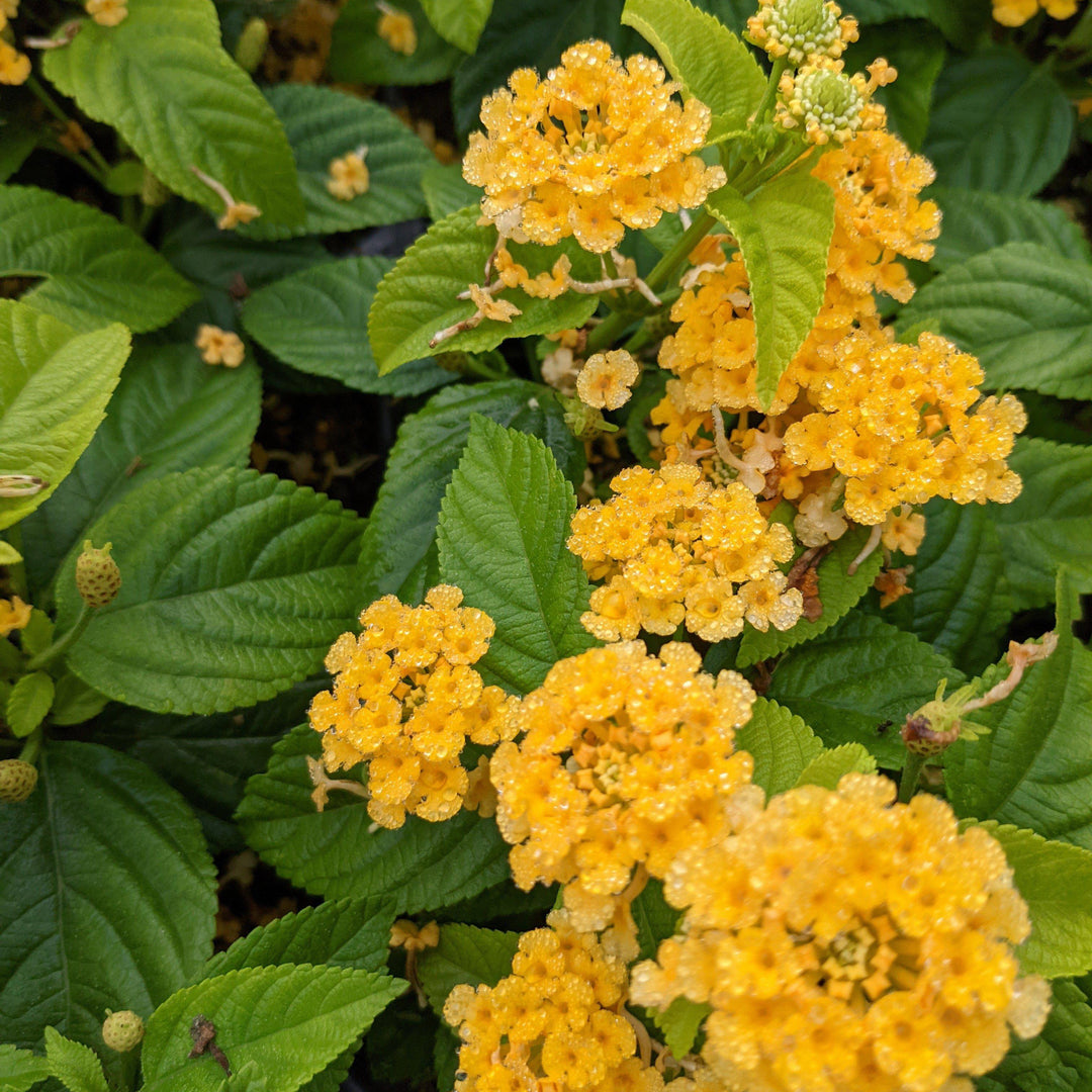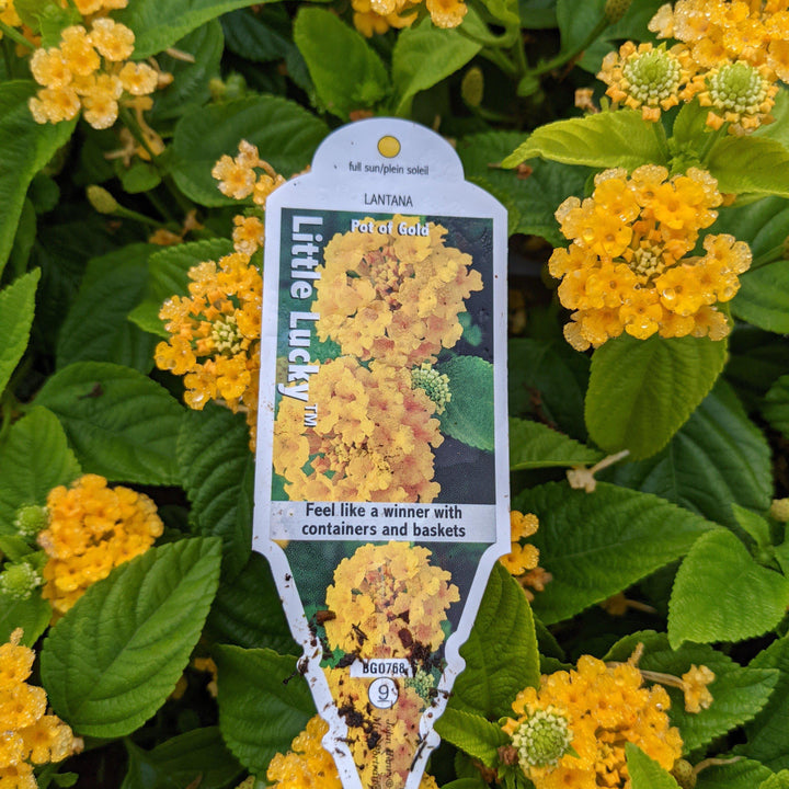 Little Lucky Pot of Gold Lantana is a compact semi-evergreen perennial that acts as an annual when planted outside with an upright habit and dark green foliage. The large clusters of rich golden yellow flower balls bloom from late spring through summer attracting butterflies. Best color in full sun and rich well-drained soil. Drought tolerant once established. Toxic if ingested.
