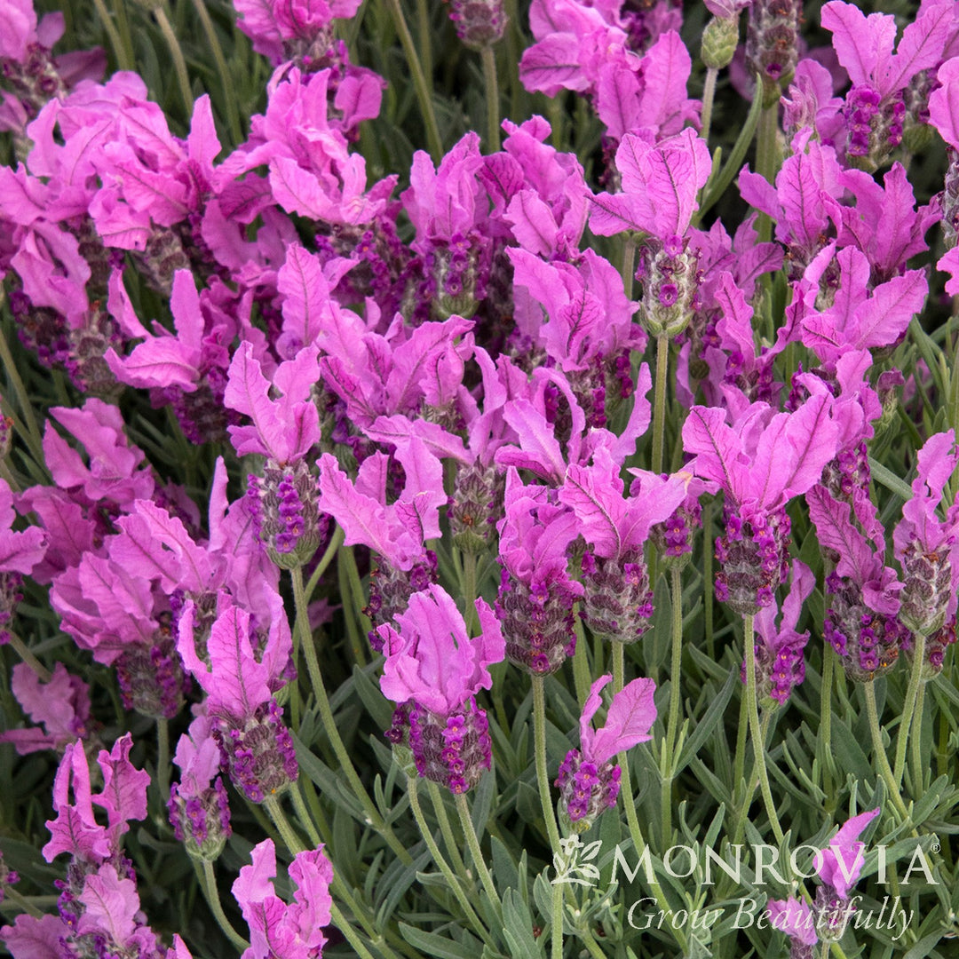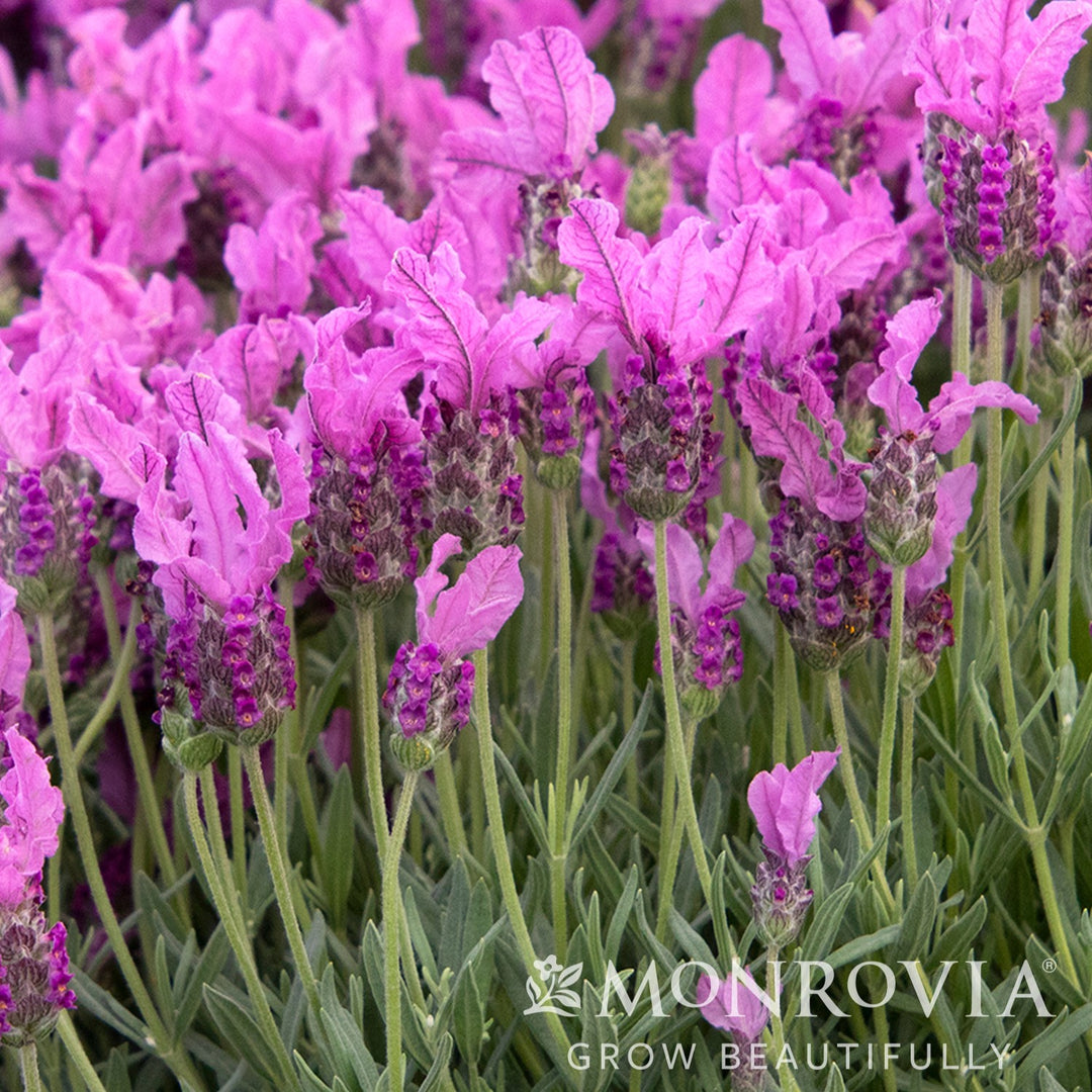 Monrovia® The Princess Spanish Lavender is a compact woody evergreen perennial with highly aromatic grey-green leaves.  The stems end with thick flowerheads with small magenta buds and large upright rich lavender-pink petals on top resembling butterfly wings bloom in heavily in spring and lightly in summer.  Grows best in full sun and dry to medium well drained alkaline soils.