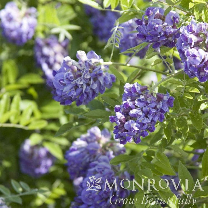 Monrovia® Amethyst Falls American Wisteria is a fast-growing twining deciduous vine native to the States with small leaves. The drooping raceme sporting fragrant pea-like lilac flowers bloom on new growth, attracting bees and butterflies in spring with a light rebloom in summer. Flat brown seedpods follow the flowers. Blooms best in full sun and well-drained soil. Amethyst Falls is not an aggressive spreader, but has low toxicity.