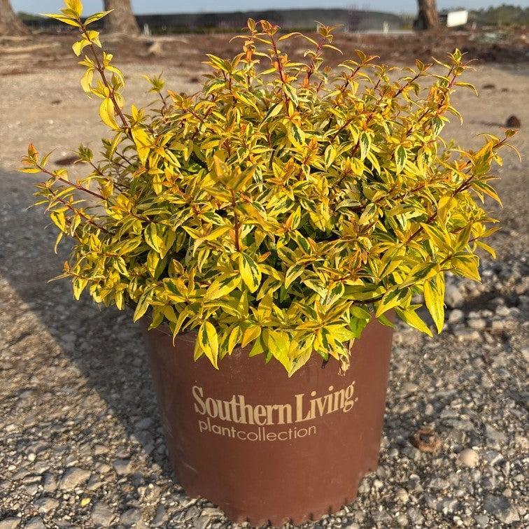Suntastic Peach Abelia is a compact, semi-evergreen shrub with a low-mounding habit and bright variegated foliage. In warmer seasons the foliage is yellow and green with touches of apricot, and as the weather cools the apricot spreads and colors intensify. The fragrant white flowers that bloom though summer into fall are highly attractive to butterflies. Flowers best in full sun and rich, moist, well-drained soils.