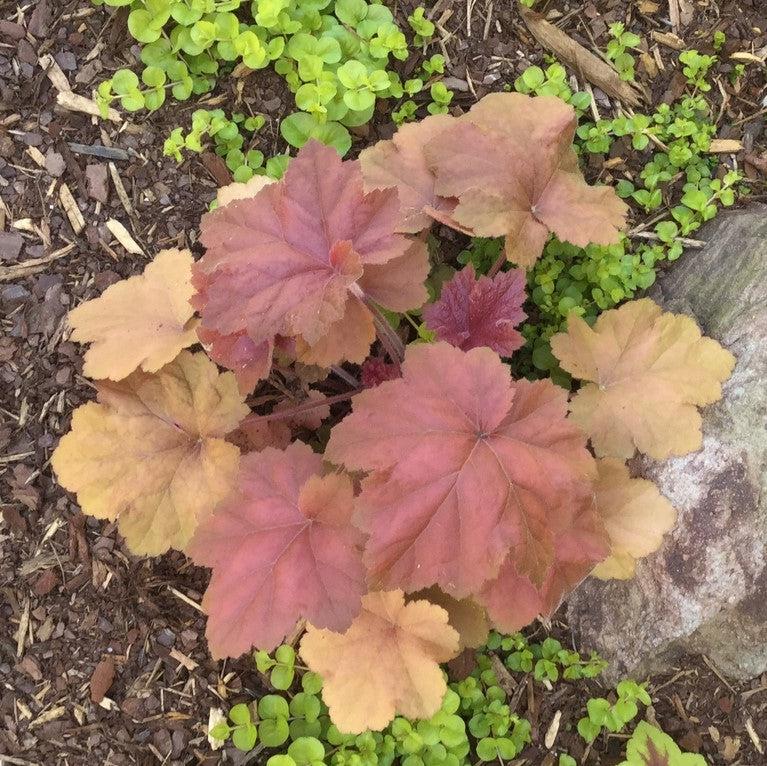 Southern Comfort Coral Bells is an evergreen herbaceous perennial with a clumping habit and bold foliage of various colors. The round-lobes leaves are a warm cinnamon-peach which ages to burnished copper in spring, with a brief stint of turning green in summer before returning to its spring copper that deepens further to amber in fall. Tiny creamy white bell-like flowers on tall spires in mid summer attracting butterflies. Best bloom in partial sun and moist well-drained soils. Southern Comfort does well in the Southern humidity in summer.