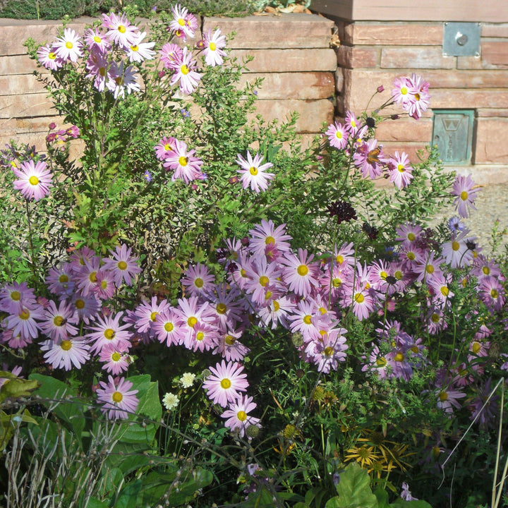 Ryan's Pink Old-Fashion Mum is a clumping perennial with rich green foliage. The large soft lavender pink daisy-like flowers with white haloed yellow centers bloom profusely from late summer through fall. Prefers afternoon shade in the south and consistently moist well-drained soil. Tolerates light shade.