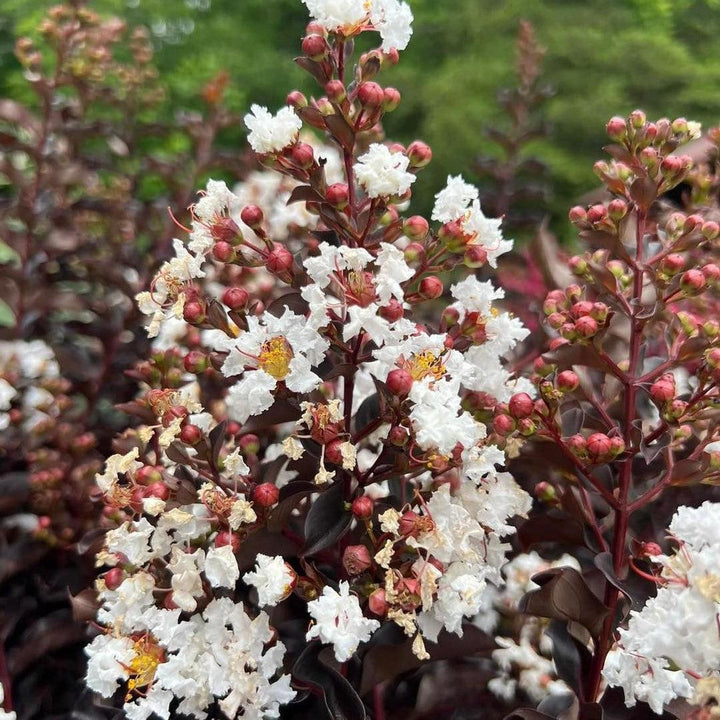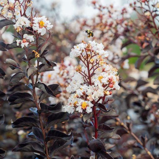 Pure White Crape Myrtle is a compact tree with an upright vase-like habit and intense inky black foliage that holds its color in summer. Large contrasting panicles of pure white flowers bloom throughout summer until frost. Prefers full sun and moist, well-drained soil. Pure White is drought tolerant and has high mildew resistance.