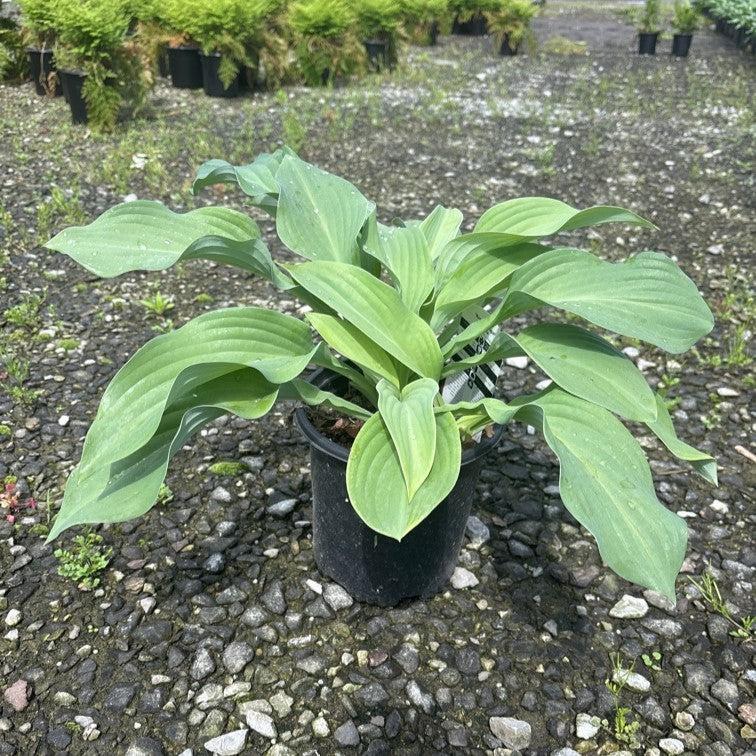 Krossa Regal Hosta is a large shade-loving herbaceous perennial with a vase shaped habit this is primarily grown for its foliage.  The large thick leaves are frosty blue green to blue-grey and have wide veins and lightly waved margins.  Small bell-like lavender flowers raise up on unusually tall scapes in mid to late summer attracting butterflies and pollinators.  Best color in partial sun and moist well-drained soils.