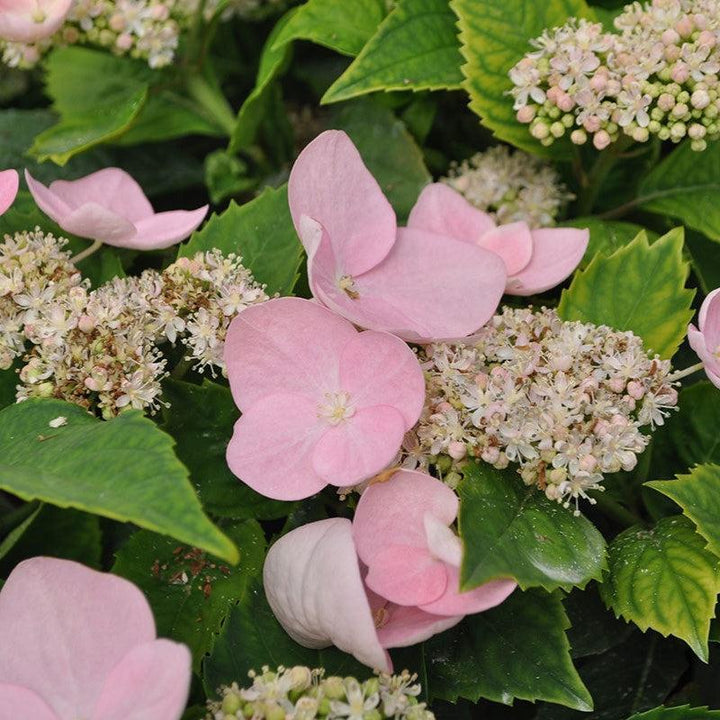 Zorro Hydrangea is a compact deciduous shrub with sturdy purple-black stems and dark green leaves that turn red in fall. The lacecap flower clusters bloom on old wood and are a combination of large and tiny flowers with color that depends on the soil PH - acidic soils produce blue while alkaline soils produce pink. The flowers attract pollinators. Best bloom in partial sun and rich, moist well-drained soils.