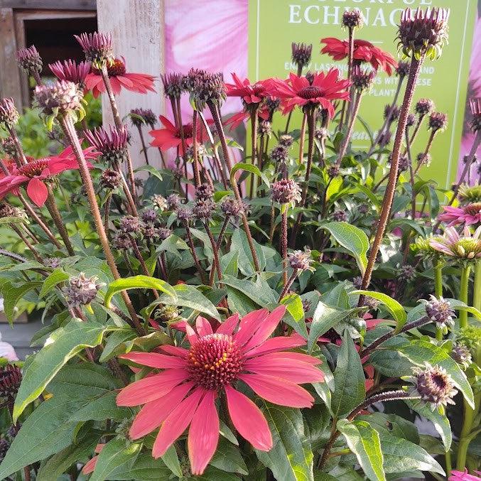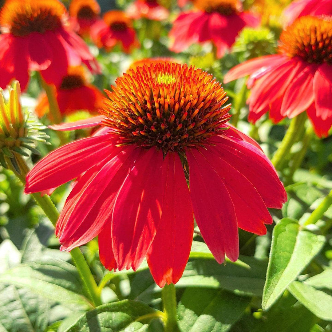 Panama Red Echinacea is a compact freely branching native perennial with strong upright stems and aromatic dark green foliage. The heavy blooms of fragrant, deep orange-red flowers with dark cones have an extra long season throughout summer and well into fall. Thrives in full sun and well-drained soils. The flowers attract butterflies and bees, and spent stems will stay erect and attract birds if not removed. Panama Red is disease resistant and drought tolerant.