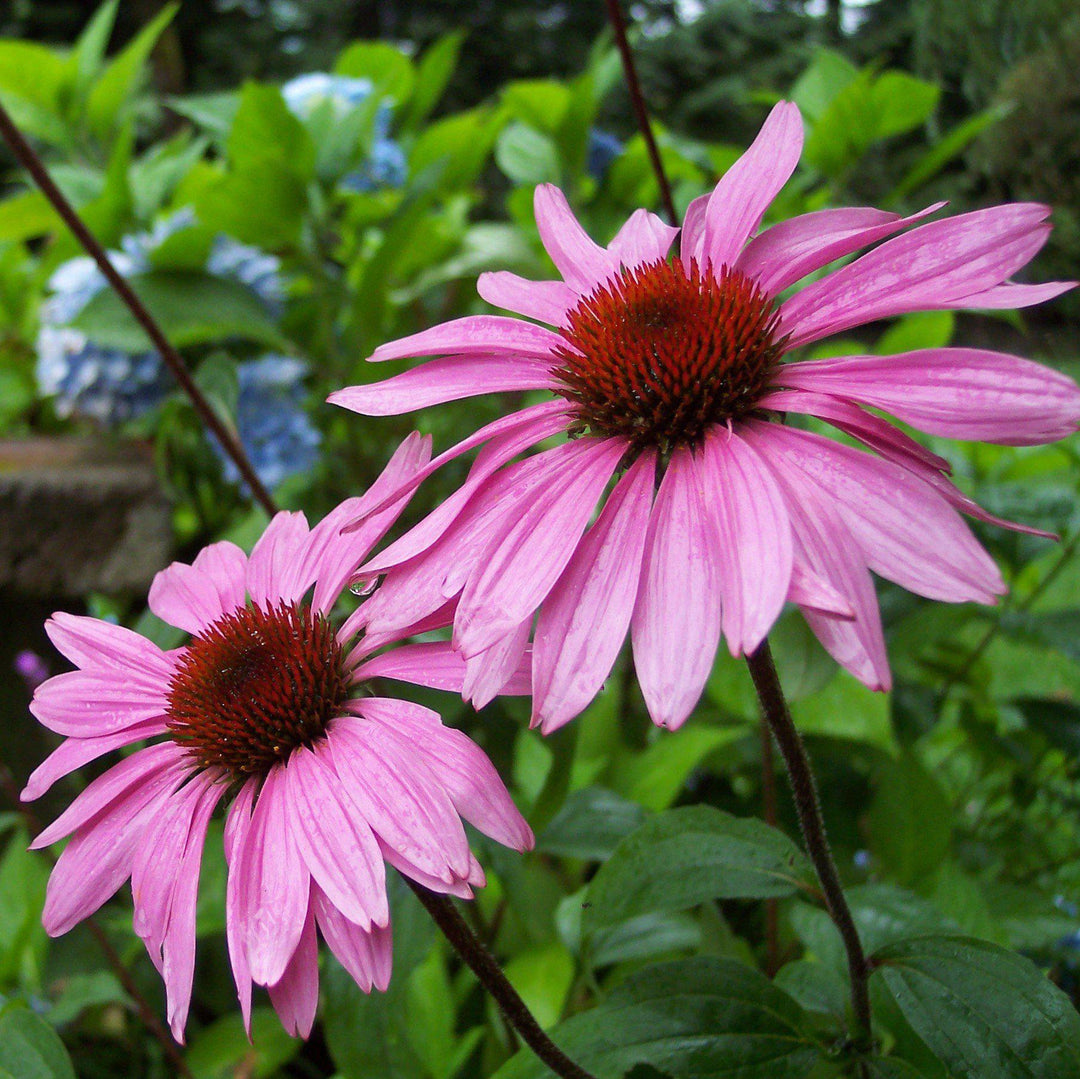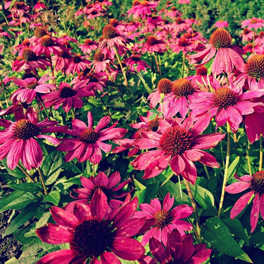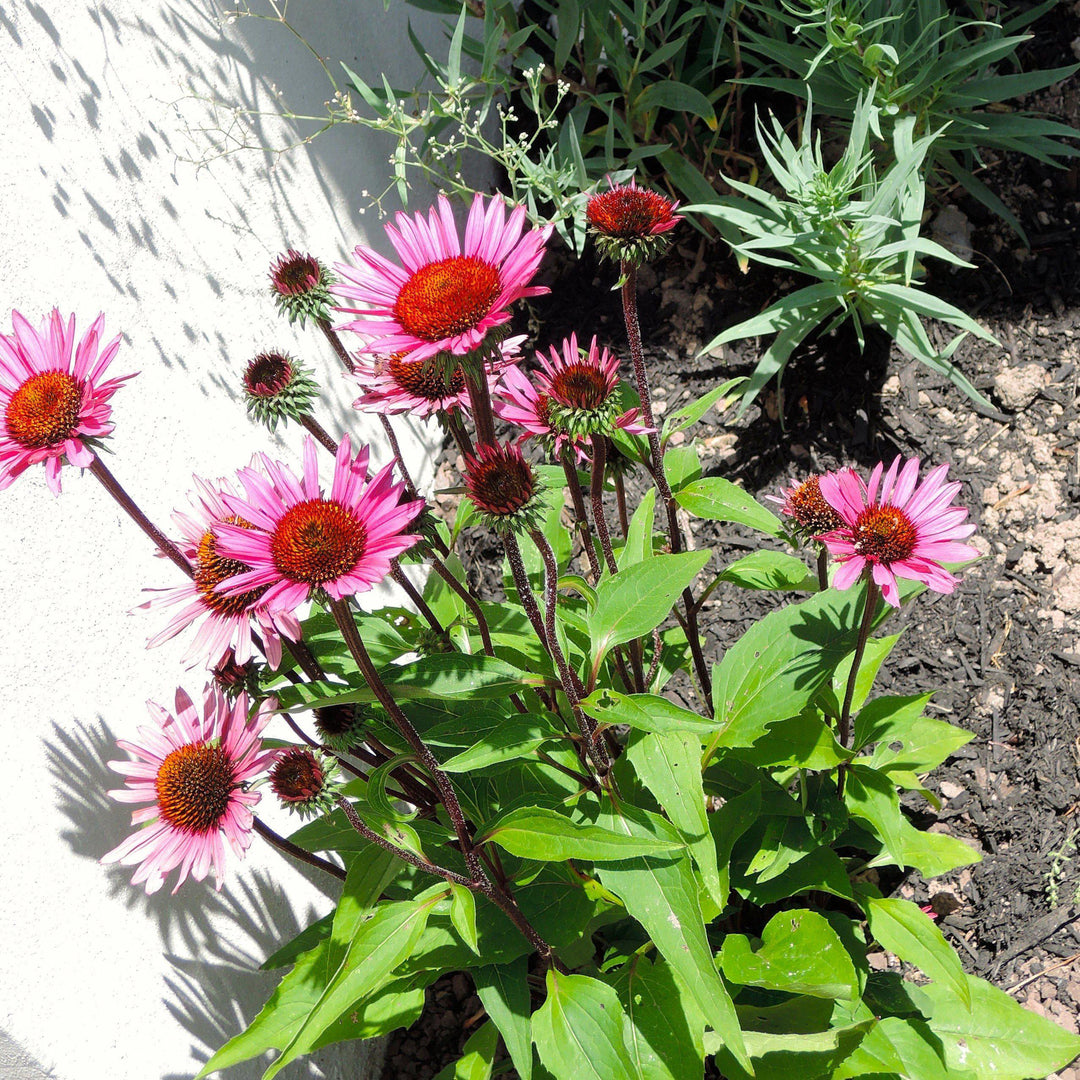 Solar Flare Echinacea is a compact upright native perennial with strong dark stems that do not need staking and grey-green foliage.   Solar Flare Echinacea has huge 5-6” fragrant flowers with downward arching petals that are magenta red that mature to a smoky rose with purple undersides and deep red center cones that bloom from late spring to late summer, and occasionally an additional bloom in fall.  Thrives in full sun and well-drained soils.  The flowers attract butterflies and bees, and spent stems will stay erect and attract birds if not removed.