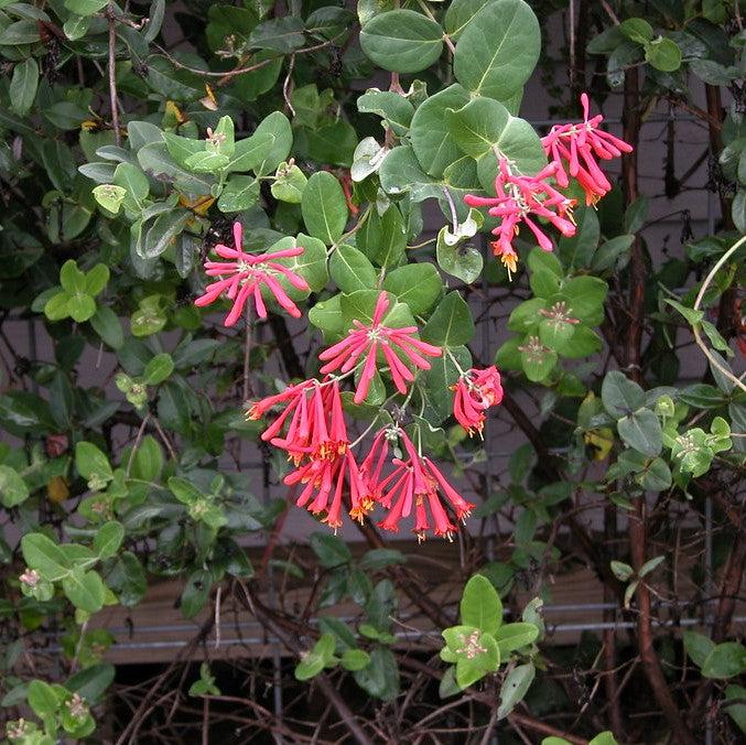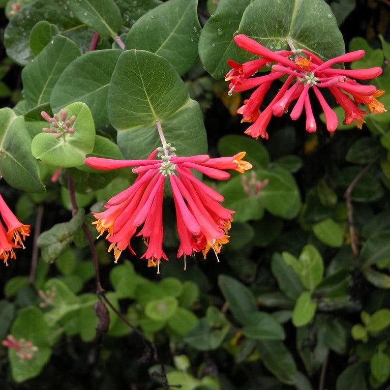 Coral Honeysuckle is a vigorous climbing evergreen shrub with blue green foliage and a long bloom season. The abundant trumpet shaped flowers are vibrant coral red with warm yellow throats and bloom from late spring throughout summer, attracting butterflies and hummingbirds. Long lasting red berries follow the flowers. Best color in part sun and well-drained soil.