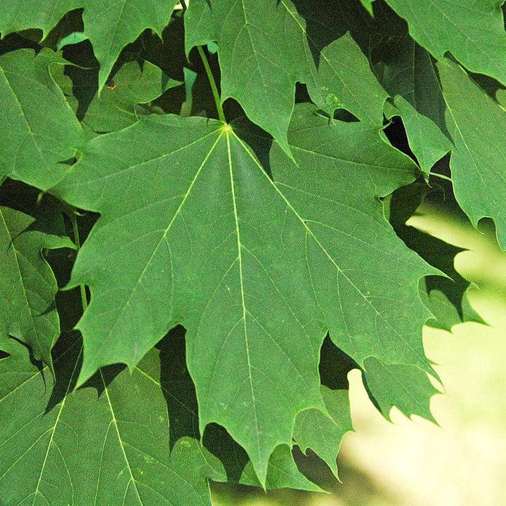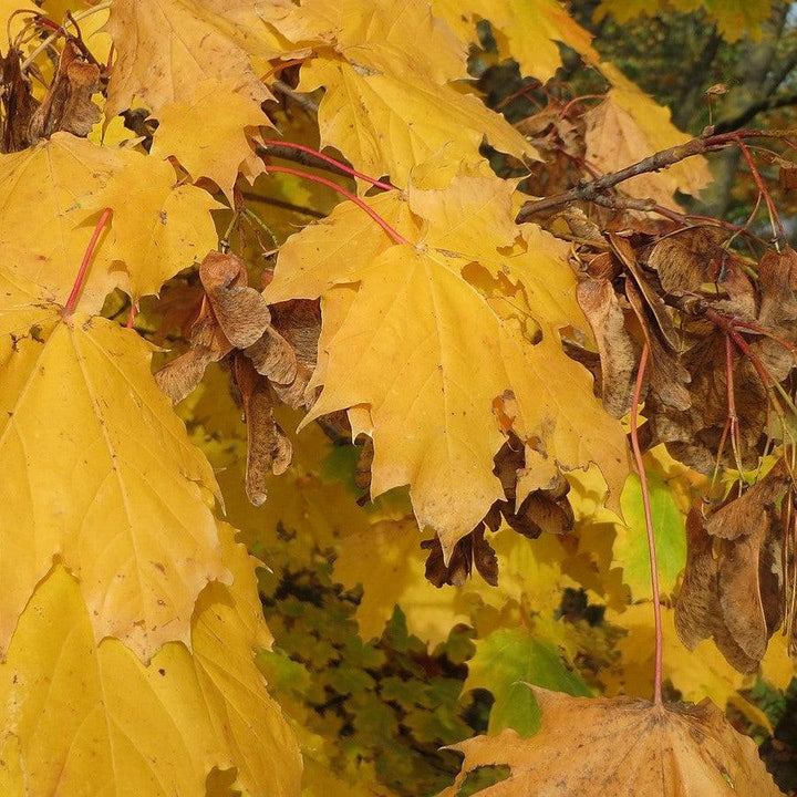Emerald Queen Norway Maple is a fast-growing deciduous tree with a very dense upright oval crown with glossy deep green palmate foliage that turns yellow in fall. Grows best in moist well-drained soils. Emerald Queen is very tolerant of strong winds and urban conditions, but note it freely self-seeds.