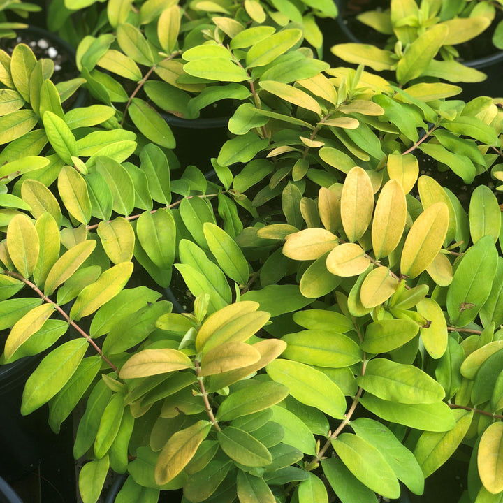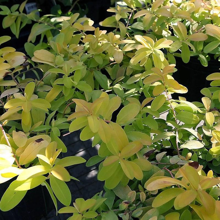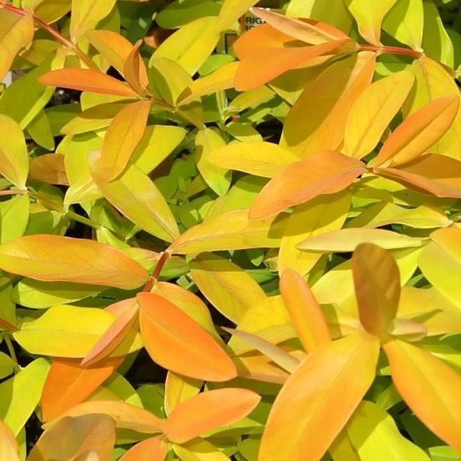 Brigadoon St. John's Wort is a creeping semi-evergreen woody shrublet with vibrant oblong foliage that emerges chartreuse, matures to golden-yellow, and earns coral to orange hues in fall .  The golden summer flower clusters blend in with the foliage.  Grows best with afternoon shade  in the south and well-drained soils.  Heat and drought tolerant once established.