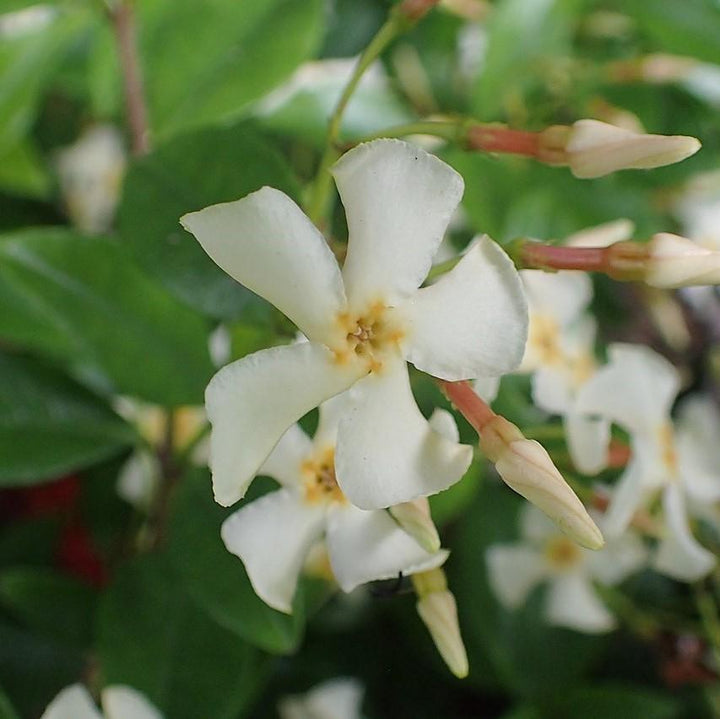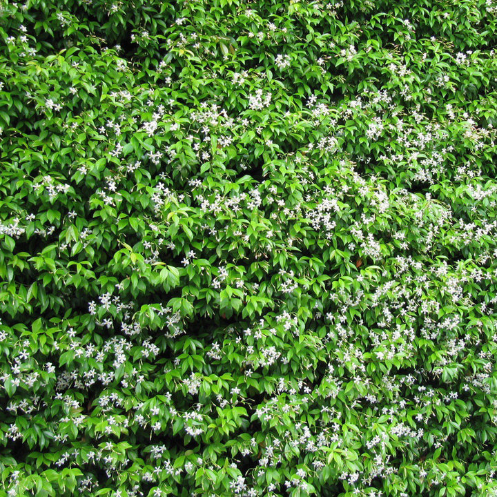 Dwarf Asiatic Jasmine is a compact hardy evergreen perennial vine that can be used for climbing or a groundcover.  The small glossy green foliage may turn bronze-red in fall.  Small fragrant creamy white flowers that age to yellow bloom in summer.  Grows best with partial sun and well-drained soils.  Drought tolerant once established.