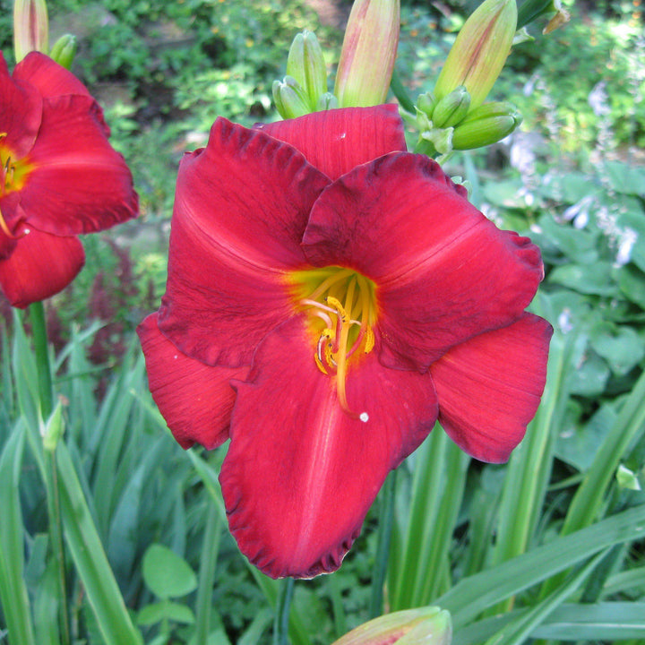 Chicago Apache Daylily is a long-blooming perennial with arching grass-like deep green foliage.  Large, loosely rippled scarlet red flowers with a vivid yellow throat bloom throughout summer.  Best bloom in deep rich well-drained soils.  Drought and salt tolerant once established.