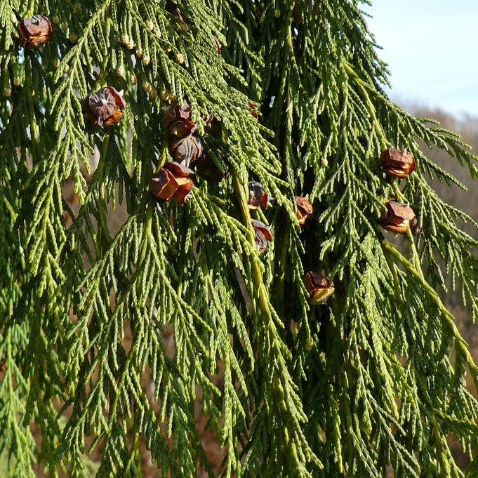Weeping Alaska Cedar is a graceful evergreen conifer tree with a pyramidal habit and pendulous branching that sweeps up at the tips.  The flattened splays of grey green to blue green foliage drape from the branches and hold their color in winter.  Prefers part sun and moist, well-drained soil. Moderate drought tolerance.