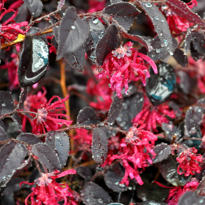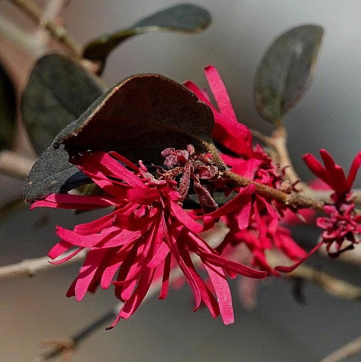 Cabernet Fringe Flower is a compact re-blooming evergreen shrub with an upright mounding habit and shiny burgundy foliage that keeps color year round. Clusters of dark red fringe-like flowers bloom from late winter through spring. Best color in full sun and moist, acidic, well-drained soil.