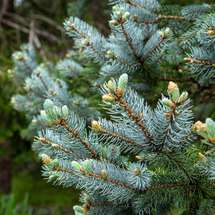 Iseli Foxtail Blue Spruce is a slow-growing native conifer shrub with horizontal branching forming a refined pyramidal habit.  Its new growth emerges as soft bright blue needles that sharpen as they mature to blue-green and hold their color in winter.  Prefers full sun and rich, moist well-drained acidic soils.