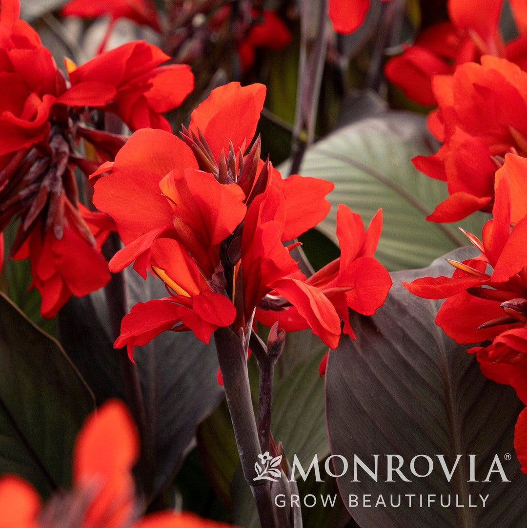 Cannova Bronze Scarlet Canna Lily is a fast-growing herbaceous perennial with a basal-clumping habit and dramatically large deep bronzed foliage. The scarlet red flowers bloom on tall stalks through summer into fall which attracts bees and butterflies. Blooms best in full sun and rich, moist well-drained soils. Deer Resistant.