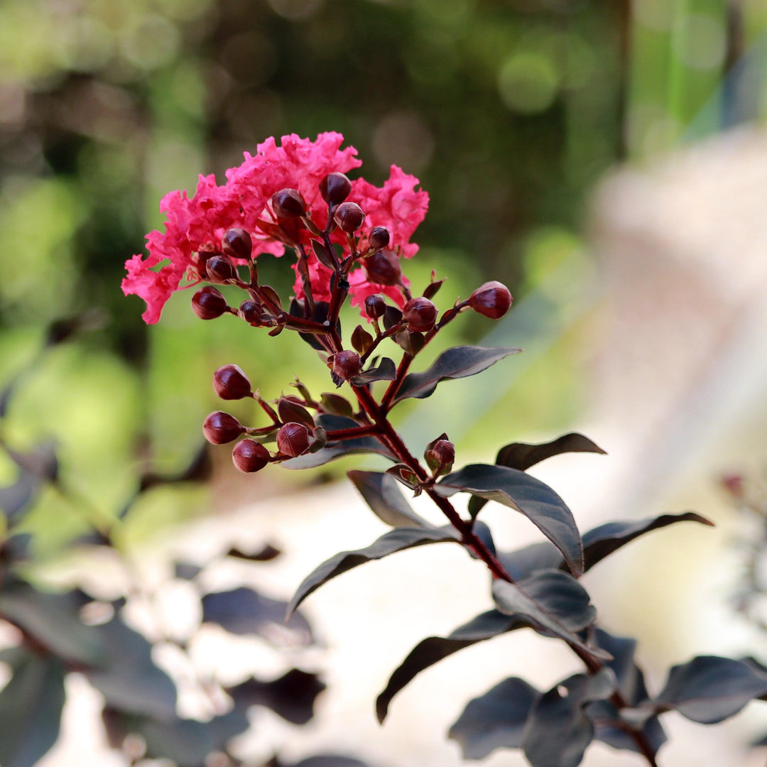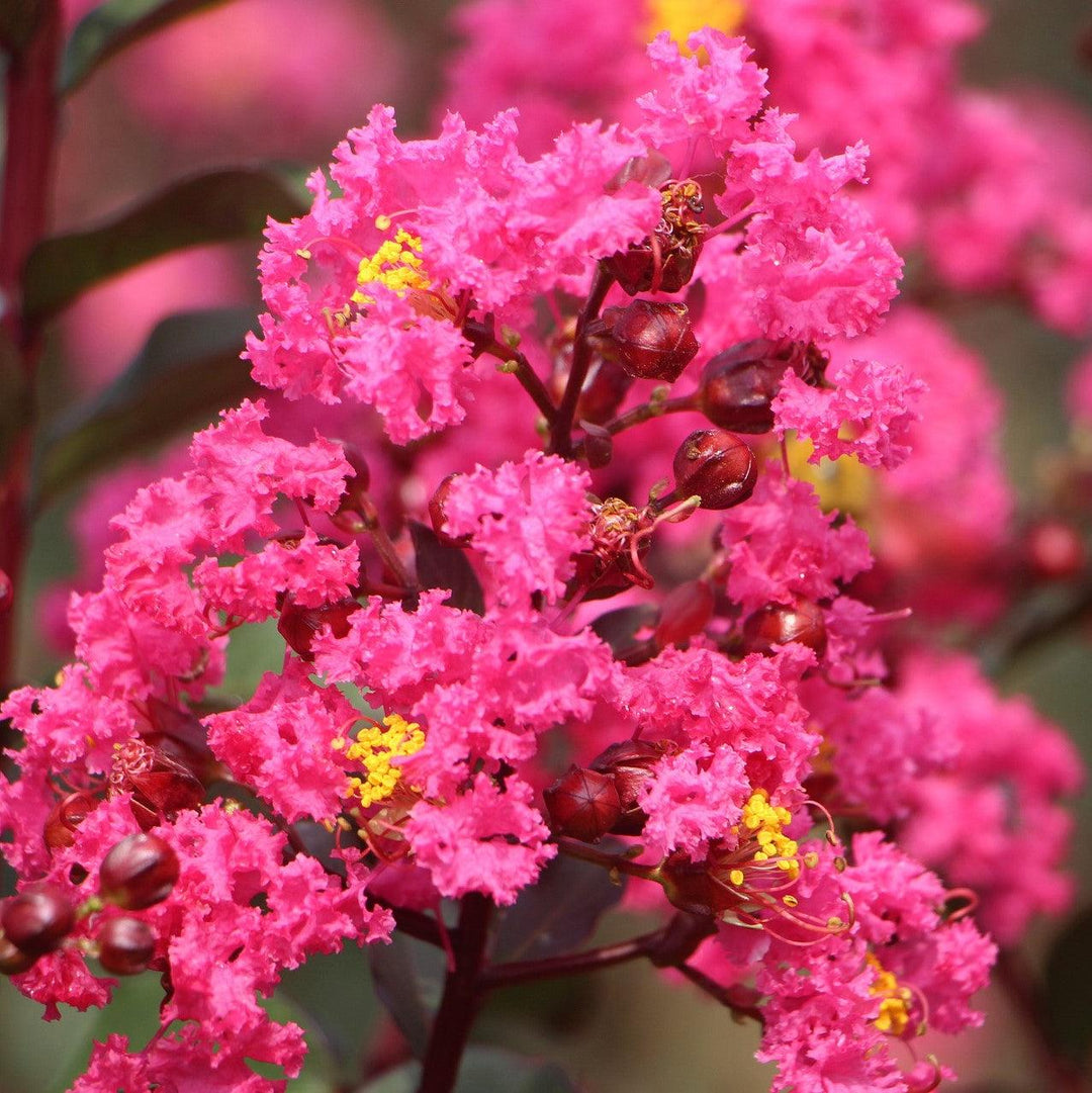 Cherry Mocha Dwarf Crape Myrtle is a small deciduous shrub with upright burgundy stems and exfoliating bark. The very dark green leaves with burgundy tips emerge a glossy deep red. Dark red buds open to heavy blooms of cherry red panicles from late summer into fall. Best color in full sun and rich, well-drained acidic soil. The BARISTA series has enhance disease resistance and cold hardiness.