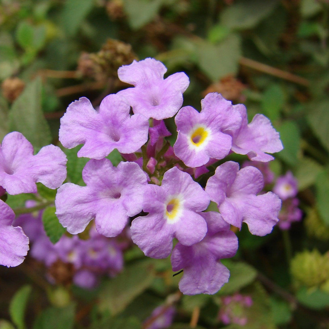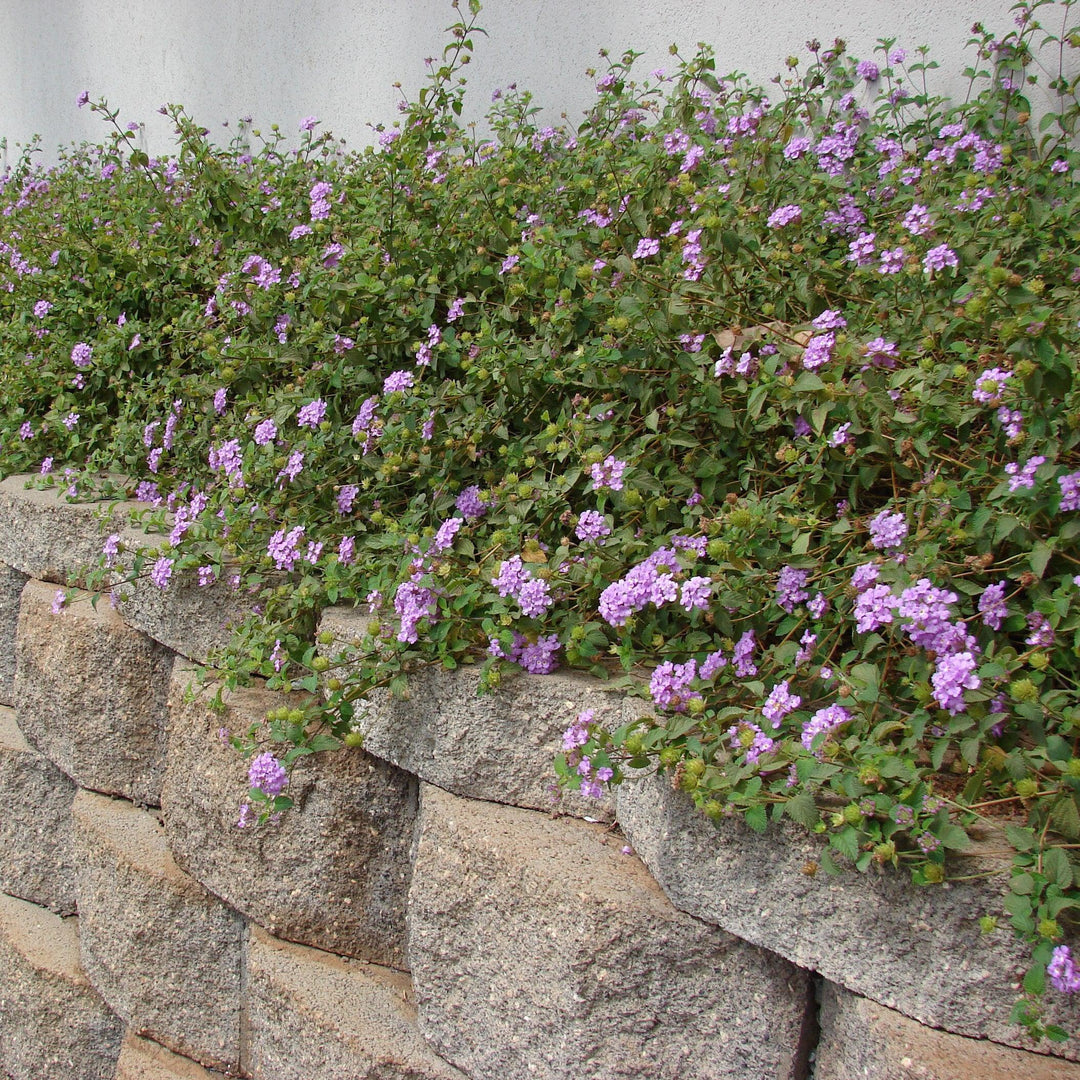 Trailing Purple Lantana is a low spreading semi-evergreen perennial with cascading stems and true green foliage. The clusters of bright lavender flowers with small white and yellow eyes bloom from spring through fall attracting butterflies. Best color in full sun and rich well-drained soil. Drought tolerant once established. Toxic if ingested. Treat as an annual in areas with frost.