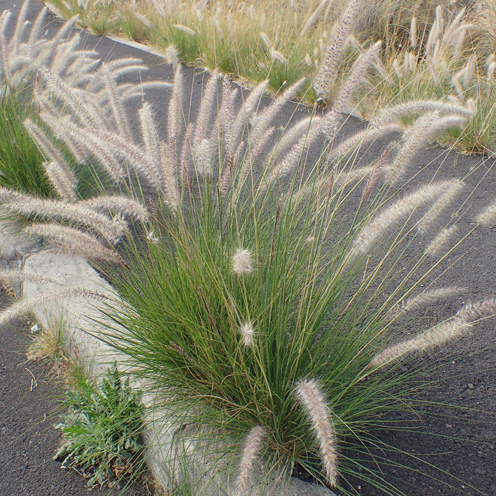 White Fountain Grass is a dramatic warm season ornamental grass with narrow green foliage that tans in fall. Upright stems sporting fluffy white bottle-brush like flower spikes bloom throughout summer and turn brown in fall. Grows best with full sun and medium well-drained soils. Drought tolerant once established.