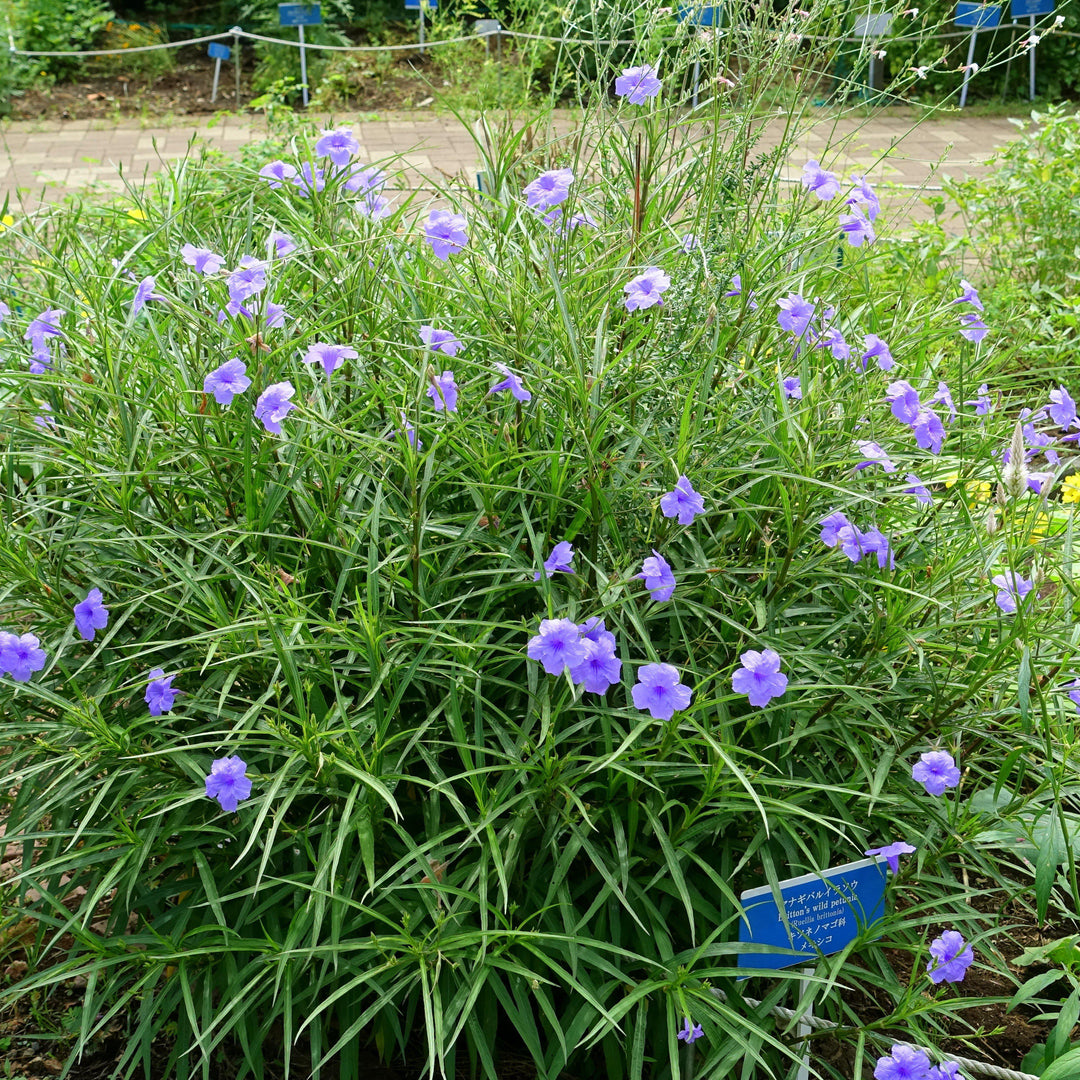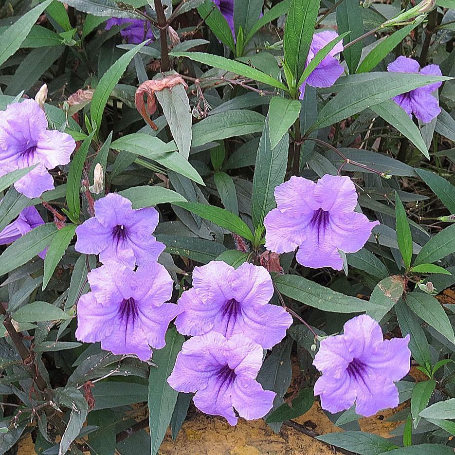 Mexican Petunia is a shrubby woody plant used as annual with woody stems and long willow-like dark green foliage that is often tinged with purple. Loose clusters of purple trumpet-shaped, petunia like flowers bloom from spring until frost. Each flower only lasts a day but is quickly replaced. Grows best with full sun and moist well drained humusy soils. Drought tolerant once established.