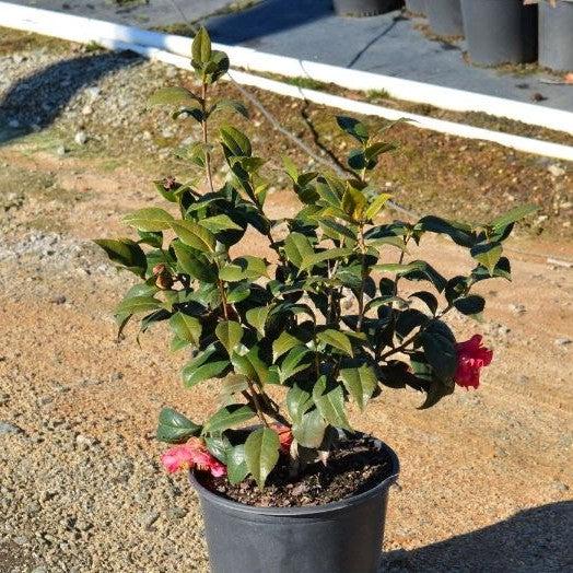 Lady Laura Camellia is a large upright evergreen shrub with glossy leaves that stay deep green year-round. Its double flowers are rich pink with deep rose stripes and yellow stamen that bloom from late winter into early spring attracting butterflies. Best blooms occur in partial sun and acidic, well-drained soil.