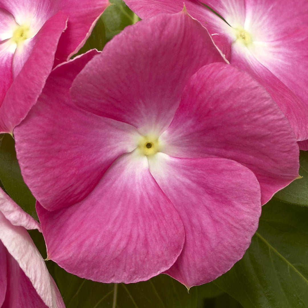 Cora XDR Pink Halo Vinca is a compact annual with mounding habit and lance-like dark green foliage. The flattened, 5-petaled vivid pink flowers with pronounced white centers bloom from mid spring and throughout summer. Flowers best in full sun and rich well-drained soils. The Cora XDR series has exceptional disease resistance.