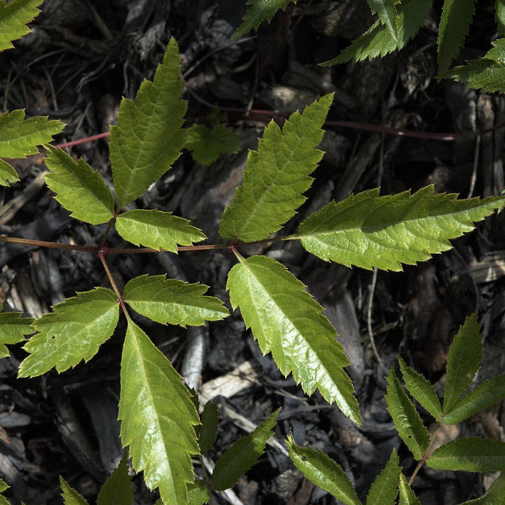 Deutschland Japanese Astilbe is a mounding herbaceous perennial with deeply divided dark green fern-like foliage. Upright triangular panicles of pure white flowers create feathery tufts above the leaves in late spring into summer. Flowers best in part shade and rich, moist soils. Astilbe are deer and rabbit resistant.
