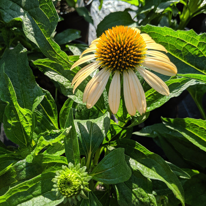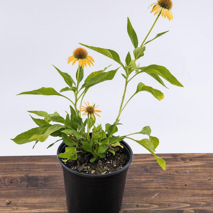 Harvest Moon Echinacea is an upright free-branching native perennial with strong stems that do not need staking and grey-green foliage. Harvest Moon Echinacea has huge 5” fragrant flowers with downward arching golden yellow petals and a light orange center cones that bloom from late spring to late summer, and occasionally an additional bloom in fall. Thrives in full sun and well-drained soils. The flowers attract butterflies and bees, and spent stems will stay erect and attract birds if not removed.