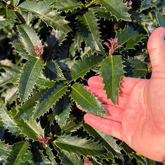 Crown Point Holly is a very dense evergreen shrub with a narrow pyramidal heavily serrated glossy dark green foliage that emerges light green. Its inconspicuous white flowers giving way to abundant red fruit that can persist well into winter. Best planted in moist, slightly acidic well-drained soils.