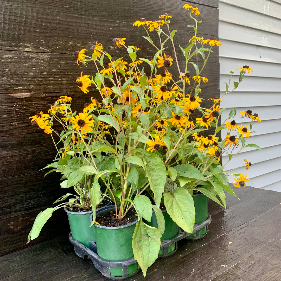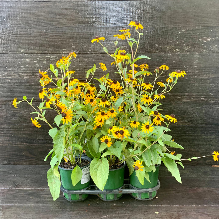 Black-Eyed Susan is a native herbaceous perennial with an upright clumping habit and dark green narrow foliage.  The large daisy-like gold flowers have a black-brown center disk and bloom from mid-summer until frost.  Flowers best in full sun and consistent moisture.  Drought tolerant once established.