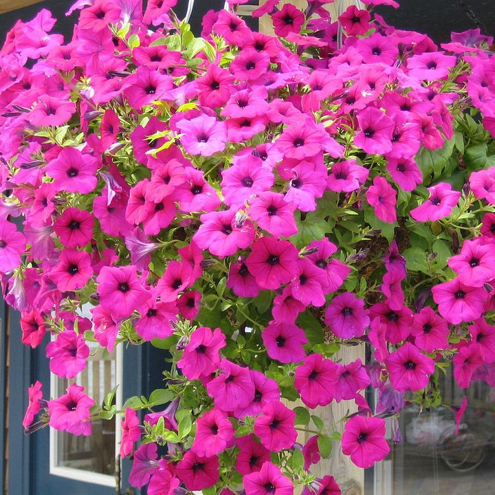 Wave Purple Spreading Petunia is a tender herbaceous perennial with a spreading habit that is grown as an annual when outside.  Its small green foliage is coated by non-stop flowering of large vibrant pinkish-purple funnel-shaped flowers with dark throats that bloom from mid spring through summer.  Flowers best in part shade and rich, well-drained soils.  Petunias do very well as container and house plants.