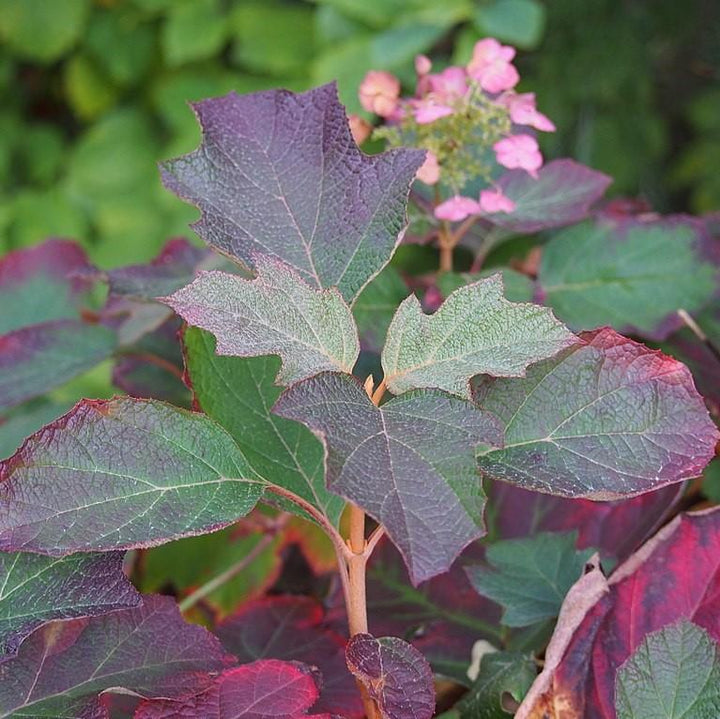 Sike's Dwarf Oakleaf Hydrangea is a compact deciduous shrub with a mounded habit, and smaller oak-like leaves that turns shades of bronze, maroon, and purple in fall.  Its conical panicles of sterile flowers open white bloom in summer and gradually fade to pink then brown.  Best bloom in part sun and rich, moist well-drained soils.