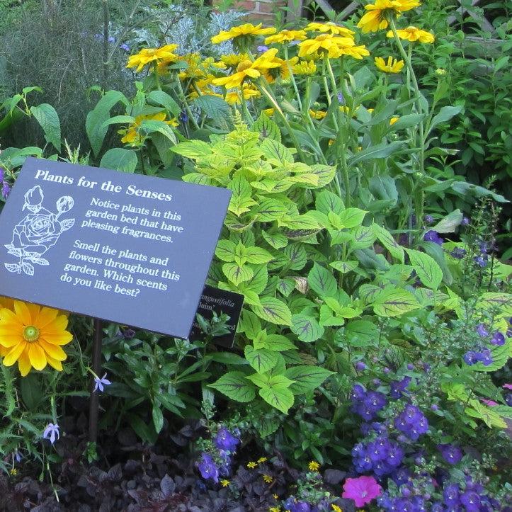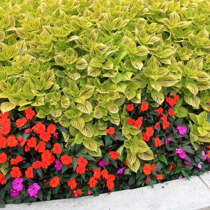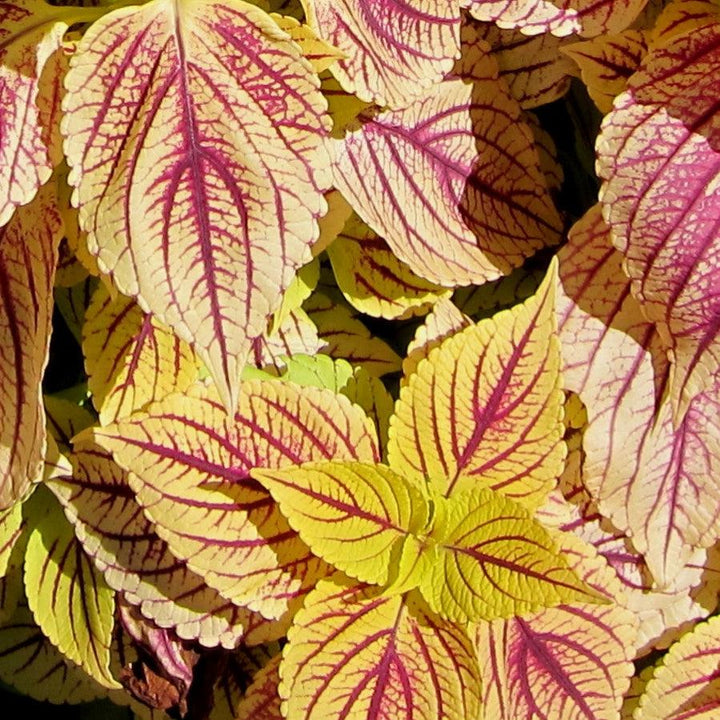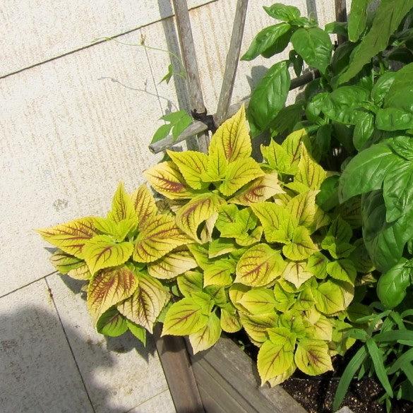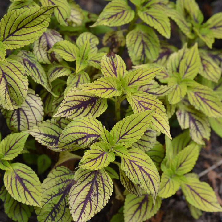 Happy Line Coleus is a tender shade-loving evergreen perennial treated as an annual primarily for its dramatic foliage. The bright chartreuse foliage has ruffled edges and deep purple veining. Its late spring to summer bloom is non showy and is often removed to maintain foliage display. Best color in full sun and moist, loose well-drained soils.