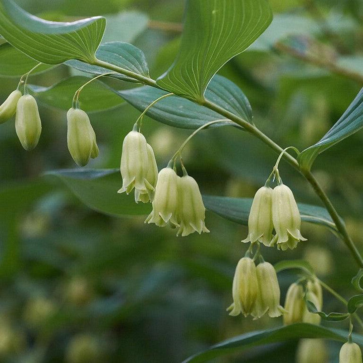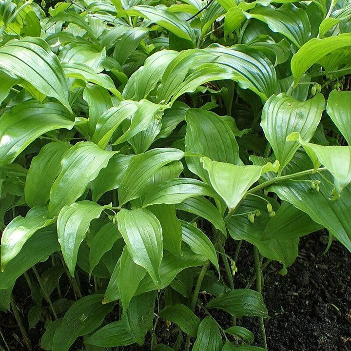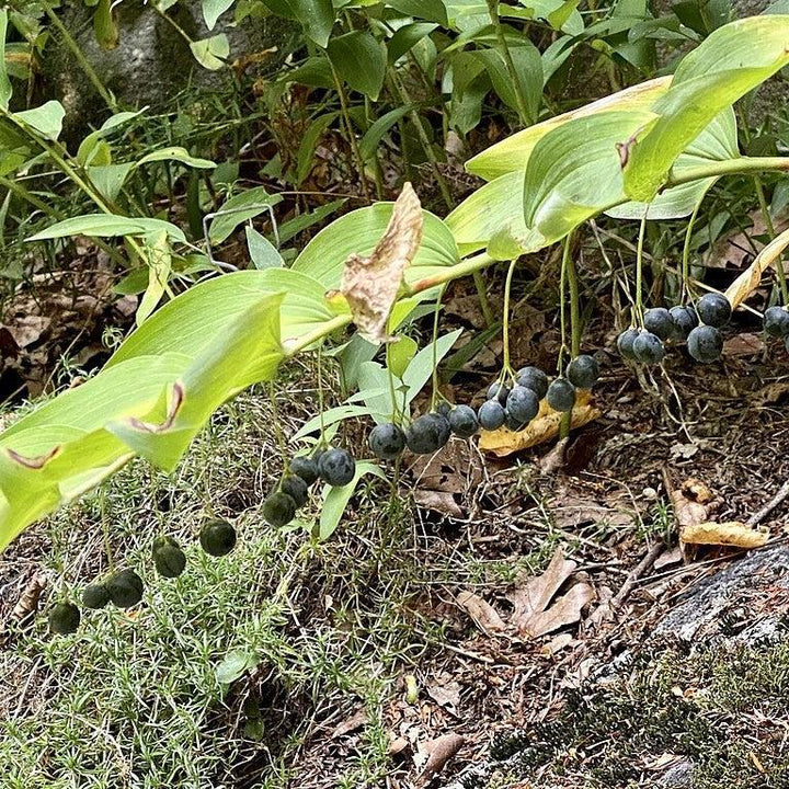 Giant Solomon’s Seal is a large native herbaceous perennial with tall arching stems and large alternating medium green leaves with noticeable veining. Clusters of small bell-shaped white flowers dangle from the leave axils in spring are followed by blue-black fruit seeds. Best grown in part shade and rich moist well-drained soils. Solomon's Seals flower blossoms, shoots, and rhizomes are edible.
