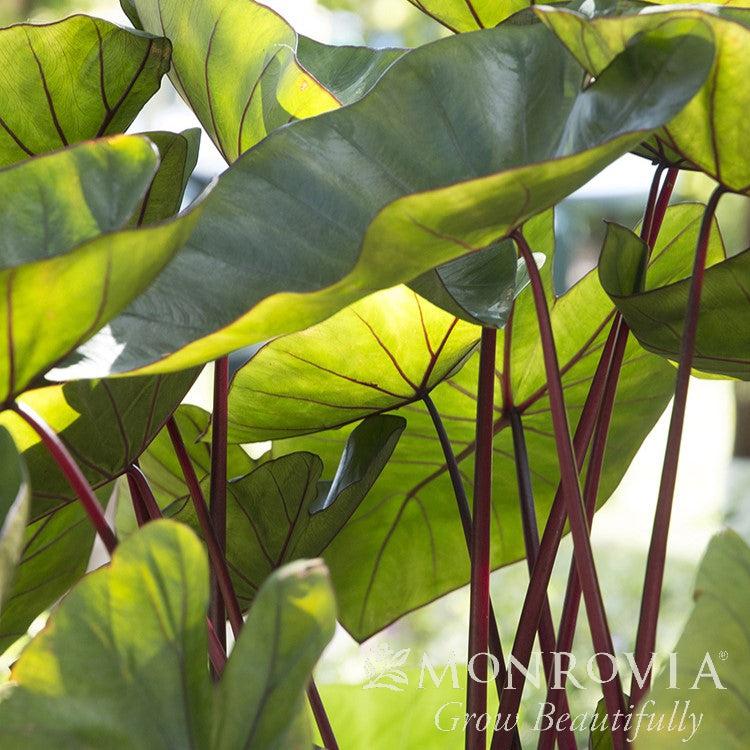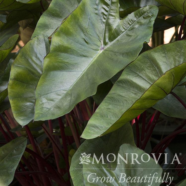 Monrovia® Hawaiian Punch Elephant Ear is a dramatic, frost tender tuberous perennial grown for its massive, lightly waved arrow-shaped foliage with red-purple stems and under veins. Its canna-lily like summer flowers are infrequent and often hidden in the foliage when they do bloom. The best color occurs with filtered light and rich, moist to marginal soils. If grown in area that experiences frost, bring inside to overwinter or treat as an annual.