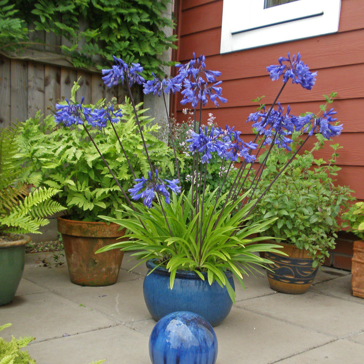 Ever Sapphire Agapanthus is a compact long-blooming perennial with green strap-like foliage and loose global clusters of large deep violet-blue tubular flowers that bloom on above the leaves from spring into fall.  Flowers best when pot-bound and consistently moist.  The Ever series is disease and pest resistant.