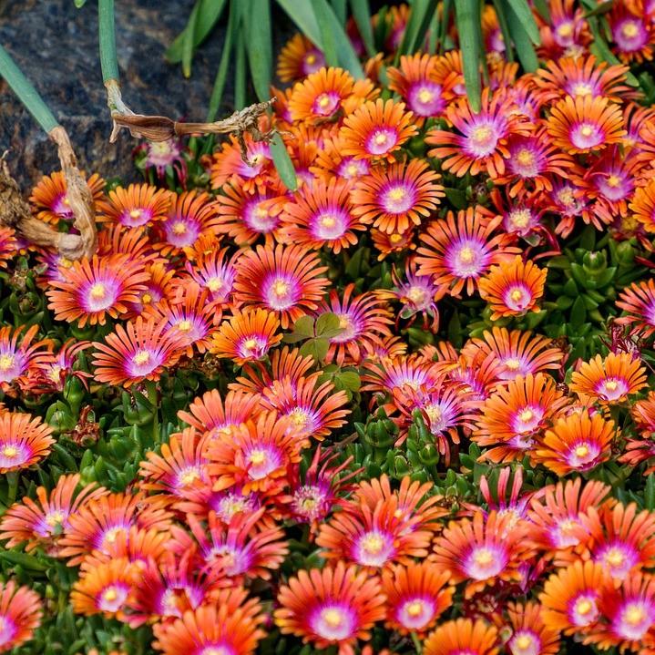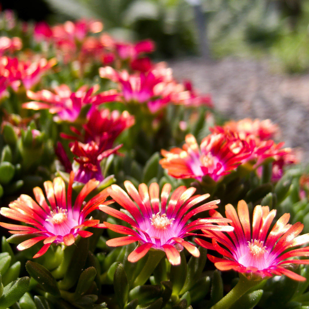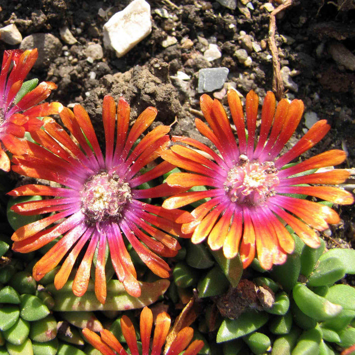 Fire Spinner Ice Plant is an evergreen succulent with dense dark green fleshy foliage and vibrant flowers that makes an excellent groundcover.  Large tri-colored daisy like flowers with layers of orange, red, and purple bloom from spring through summer.  Needs full sun and dry, sharply-drained soils.  Heat and drought tolerant.