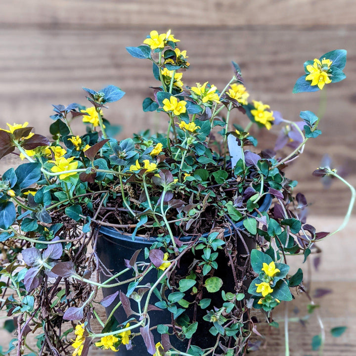 Eco Dark Stain Creeping Jenny is a spreading evergreen perennial that forms a dense mat of tiny dark green leaves with burgundy overtones.  Small yellow cup shaped flowers with distinctive red throats bloom profusely from mid spring throughout summer.  Best color in full sun and moist well-drained soil.