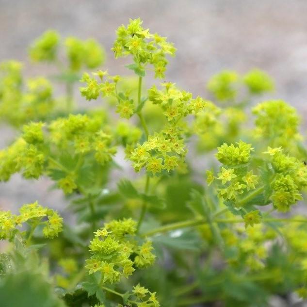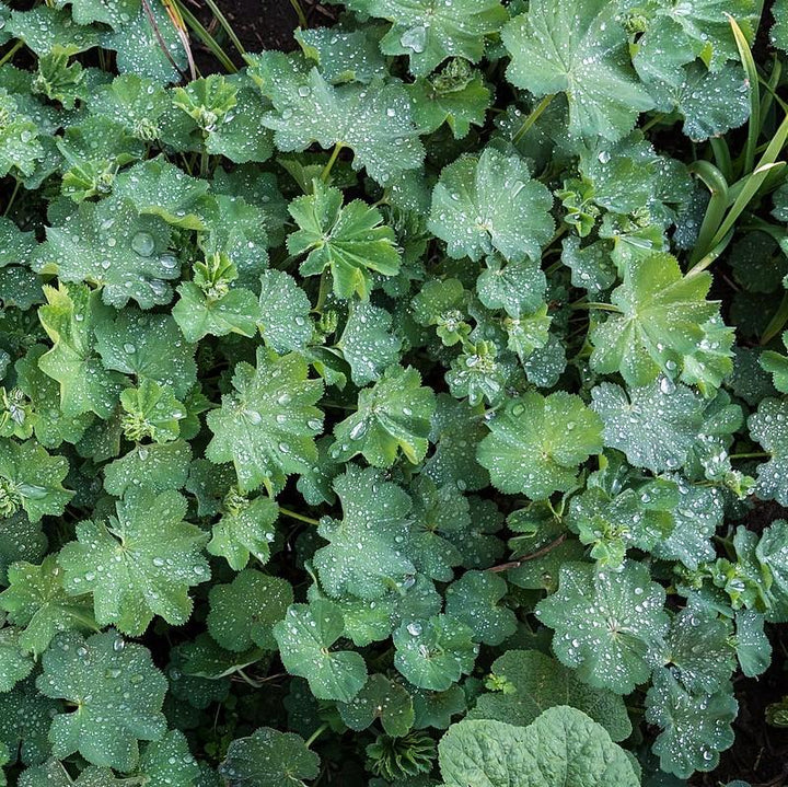 Lady's Mantle is a clumping herbaceous perennial that forms a long-stemmed basal mound. The light to blue green circular foliage is scalloped and has 9-11 lobes with soft downy hairs. Small spreading clusters of star-shaped chartreuse flowers bloom in summer and can experience another lighter bloom if deadheaded. Grows best with afternoon shade in the South and well-drained soils. Lady's Mantle tends to keep beads of moisture after a rain, creating additional ornamental value.