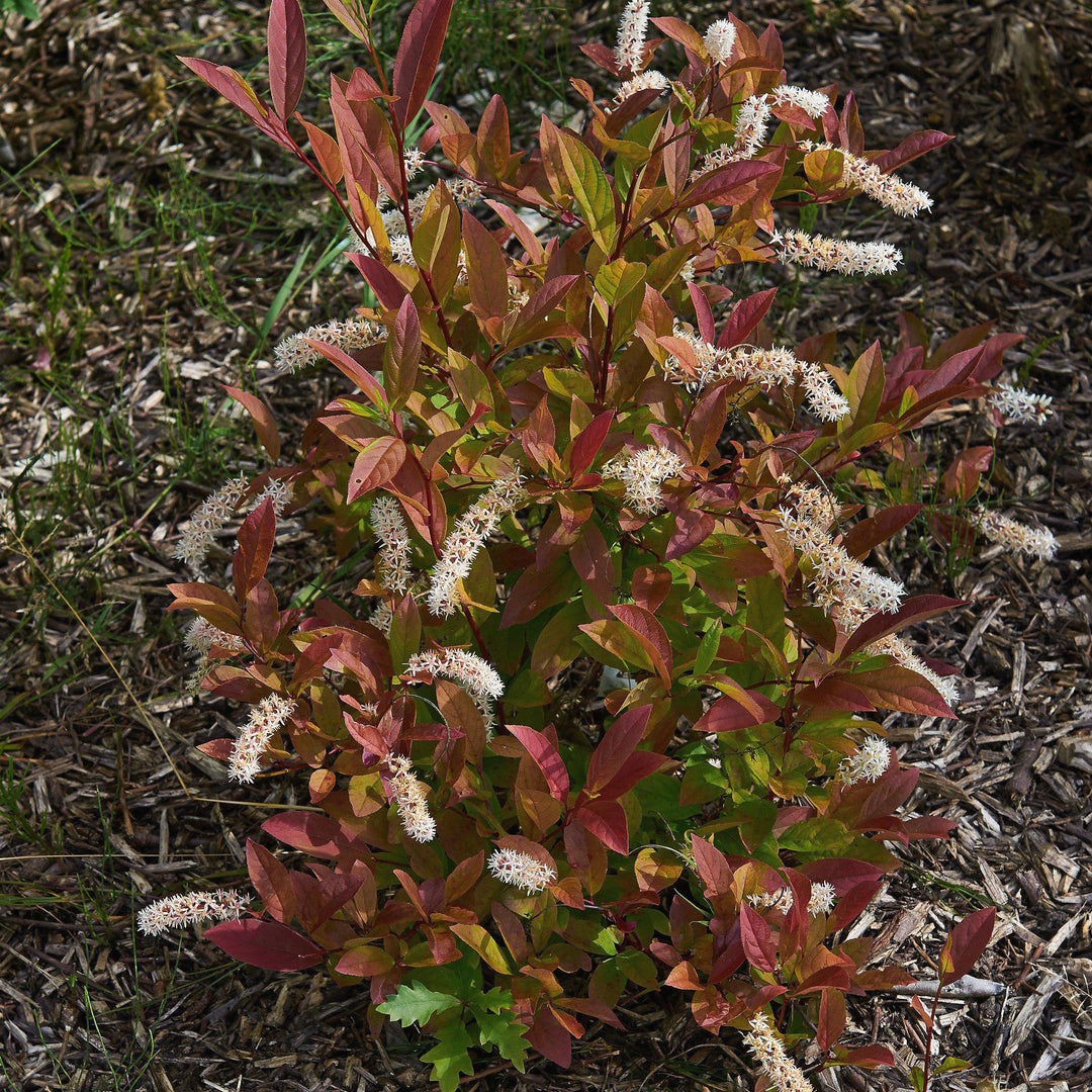Henry’s Garnet Sweetspire is a broad rounded deciduous shrub that has long-lasting fall color. The dark green oval leaves turn brilliant scarlet in fall and hold until early winter before being dropped. Small fragrant white flowers bloom on drooping cylindrical racemes from spring into summer and are followed by berries. Prefers rich, moist to wet well-drained soils. Can form dense colonies if suckers are left unchecked.