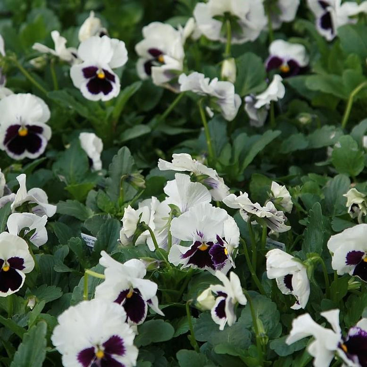 Delta White Blotch Pansy is a uniform long-blooming perennial that is tightly branched and has dark green leaves. The fragrant white flowers with a deep violet face bloom from fall to spring. Prefers full sun and moist well-drained soils.