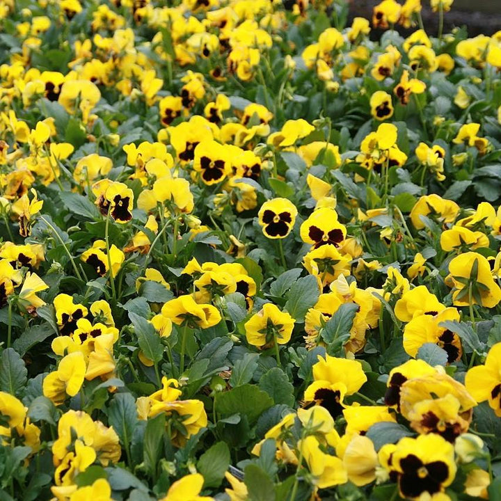 elta Yellow Blotch Pansy is a uniform long-blooming perennial that is tightly branched and has dark green leaves. The fragrant cheery yellow flowers with a near-black red face bloom from fall to spring. Prefers full sun and moist well-drained soils.