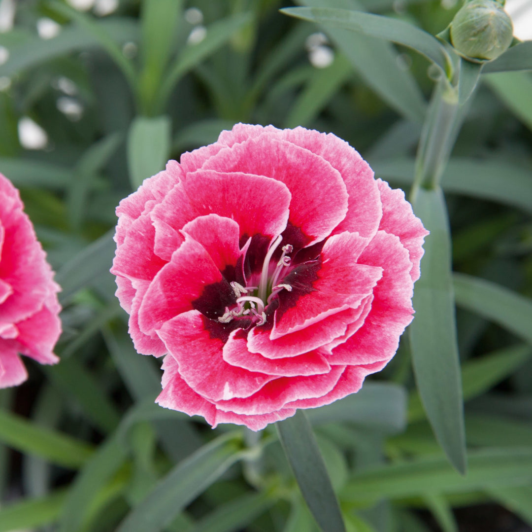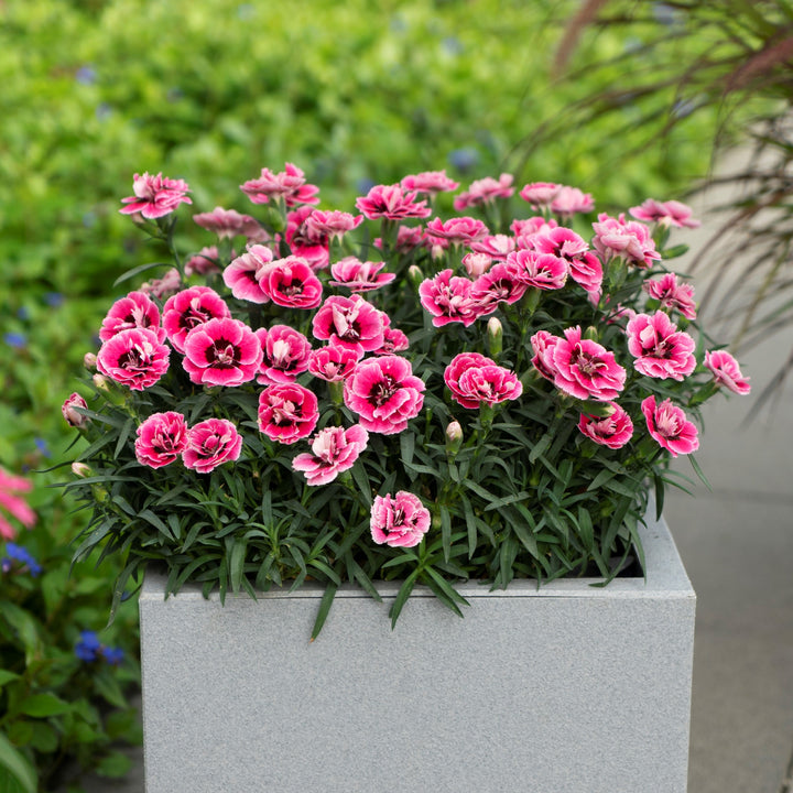 Capitan Pink Eye Dianthus is a dwarf mat-forming evergreen perennial with deep green foliage and sturdy hairy stems. Clusters of fragrant frosted rich pink double flowers with fine white edging and dark eyes bloom continuously from spring through fall if deadheaded. Blooms best in full sun and slightly alkaline, moist, and well-drained soil.