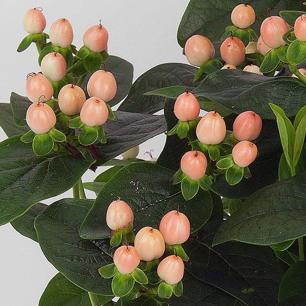 Miracle Horizon St. John's Wort is a low-mounding semi-evergreen shrublet with distinctly veined deep green oblong foliage which blushes red in fall and is frequently planted as a groundcover. Bright yellow flowers with bushy stamen cover the plant in summer and striking pink berries that last from late summer through fall. Best bloom in full sun and well-drained soils. Heat and drought tolerant once established.