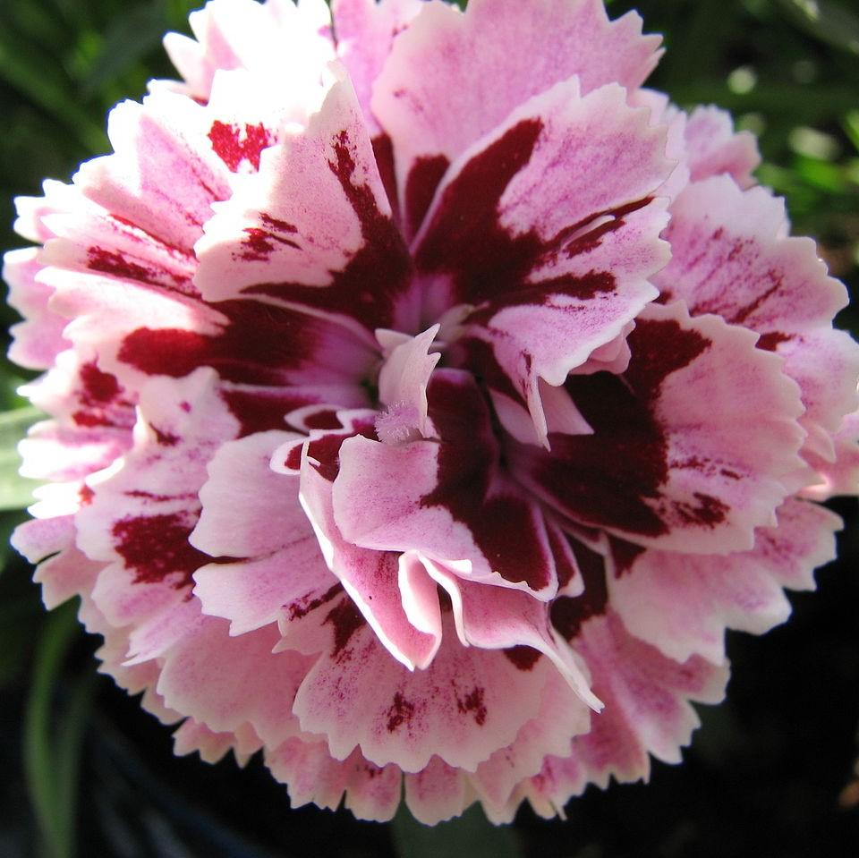 Lilac+Eye Dianthus is a compact mat-forming evergreen  perennial with dark green foliage and hairy stems. Highly fragrant double deep lilac flowers with burgundy eyes and frilled edges bloom first in late spring into summer, and again in fall if deadheaded.  Blooms best in full sun and slightly alkaline, moist, and well-drained soil.