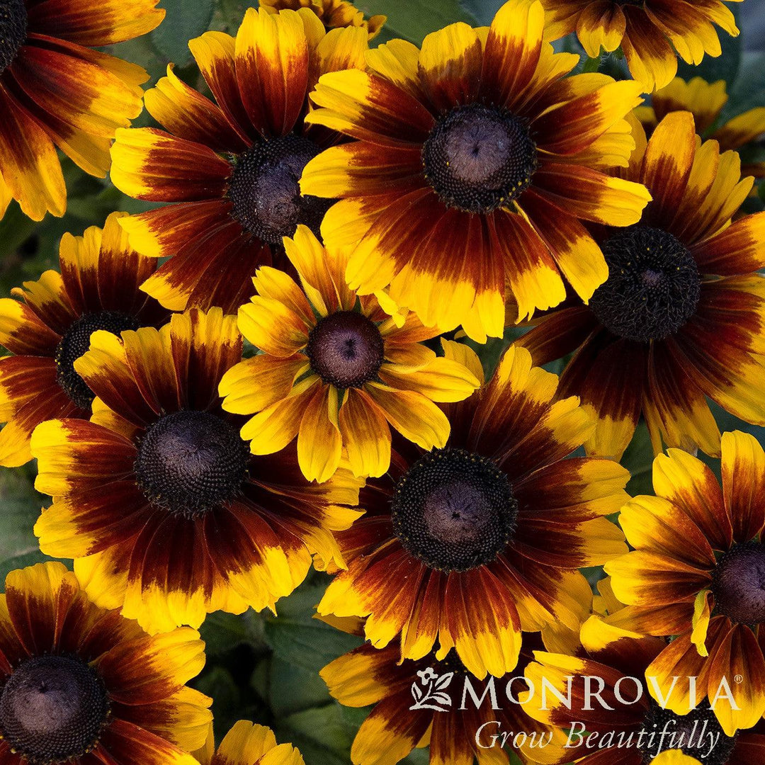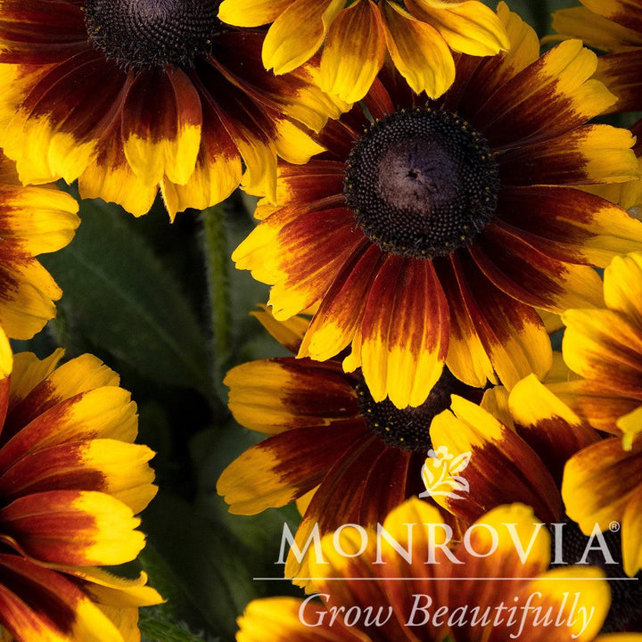 Monrovia® Kissing Black-Eyed Susan is a compact native herbaceous perennial with a dense upright mounding habit and dark green narrow foliage. Heavy blooms of large semi-double deep garnet daisy-like flowers with golden tips and a prominent black-brown center disk last all summer until frost. Flowers best in full sun and consistent moisture. Drought tolerant once established. Deadheading will prolong the bloom time.