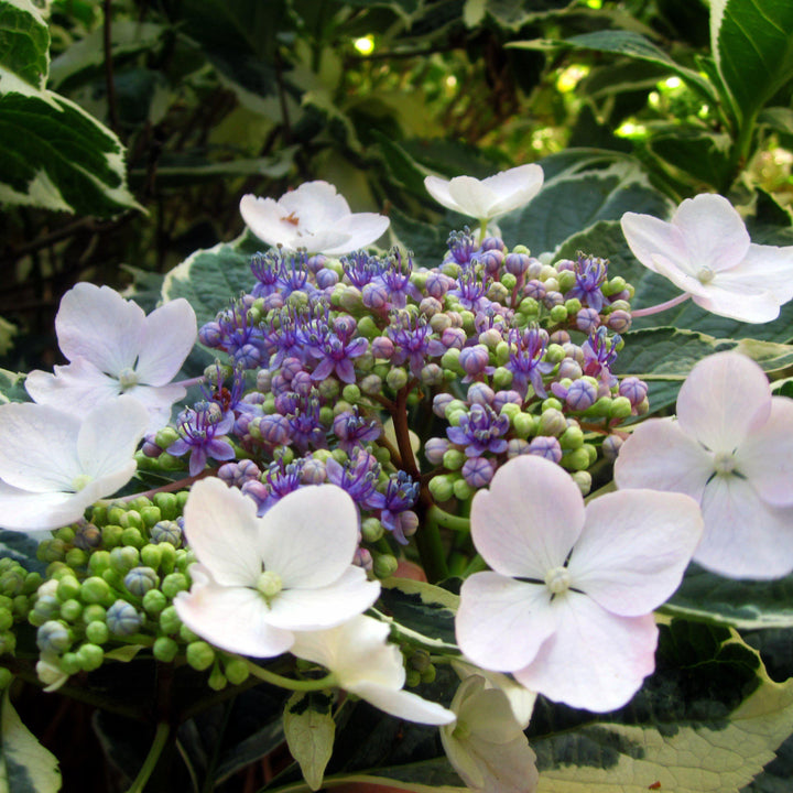 Variegated Hydrangea is a compact deciduous shrub with large olive green that has fine cream margins. The large rounded mophead panicles bloom in early summer. While the larger outer petals are white regardless, the tiny inner flowers color depends on the soil PH - pink in acidic soils, and blue in alkaline soils. Best bloom in partial sun and rich, moist well-drained soils.